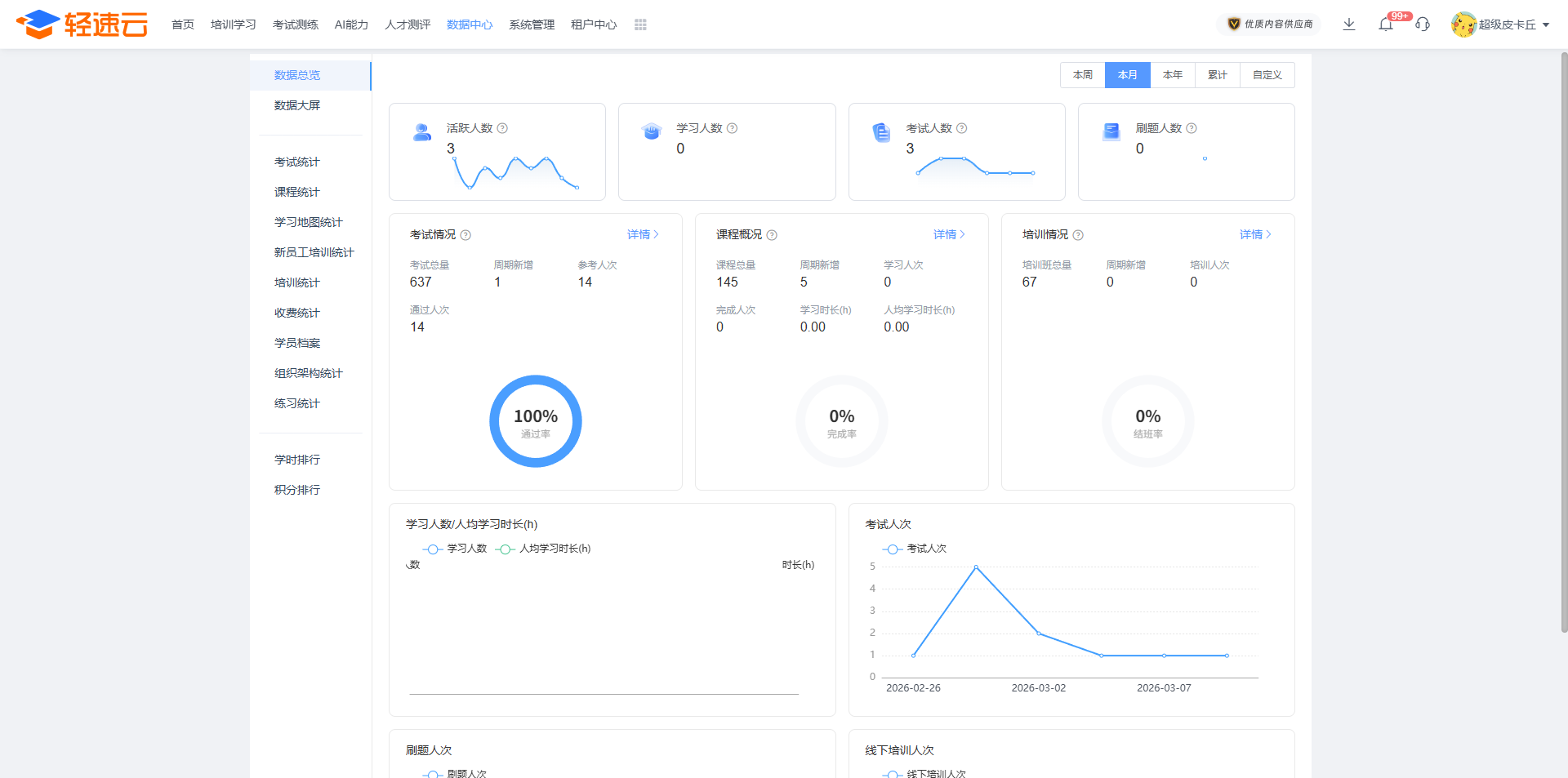 当考试、课程、学习地图等任务开始运行后,数据中心 可以帮助管理员查看整体培训效果,包括考试统计、课程统计、学习地图统计、组织架构统计、学员档案等多种分析结果。