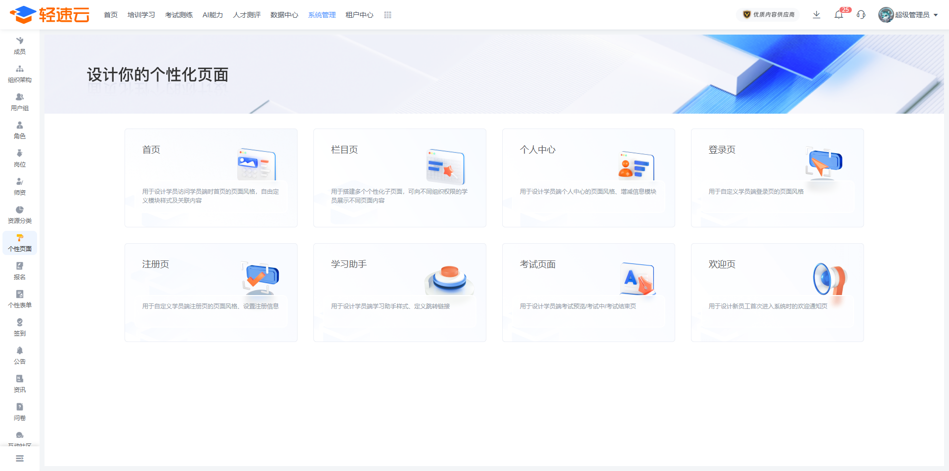 个性页面 负责调整成员端和部分考试页面的展示效果,包括首页、登录页、注册页、个人中心、考试页面等。管理员可以根据机构自身品牌和使用场景,配置页面入口、栏目结构、图片内容和视觉呈现。