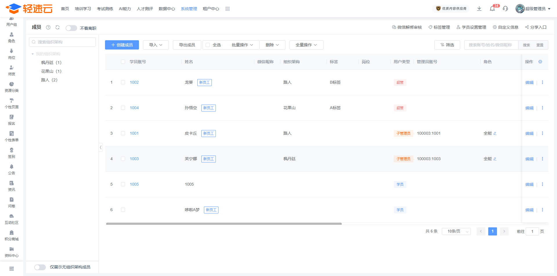 成员管理 、 组织架构 和 角色权限 共同构成了平台的人员管理基础。管理员可以维护成员资料、批量导入人员、设置标签和自定义信息,也可以按部门建立组织架构,并为不同管理员分配不同权限。