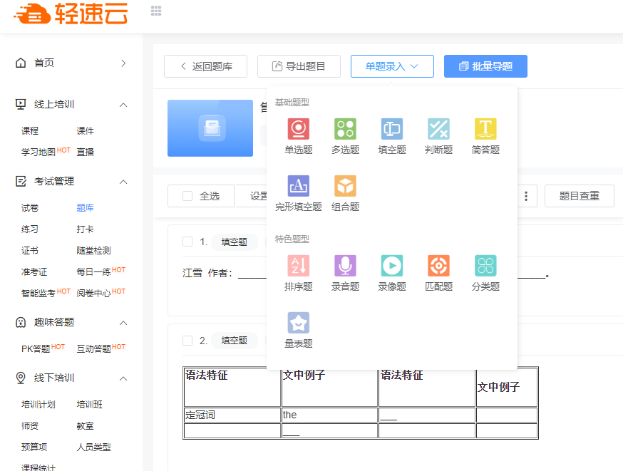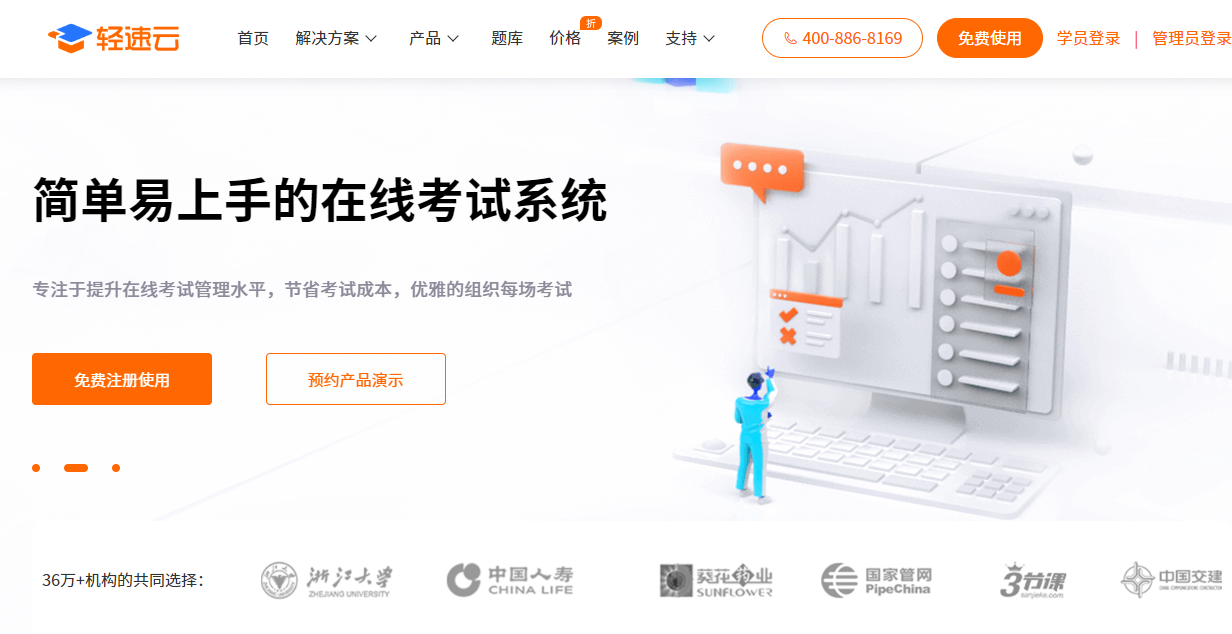 轻速云是一款功能强大的在线考试系统,适用于各类企业、机构和学校。它支持多种题型,包括选择题、填空题、判断题等,还可以自定义题型,满足不同考试需求。轻速云具备智能组卷、自动阅卷、成绩统计等功能,大大提高了考试效率。此外,轻速云还支持多种设备接入,员工可以在电脑、手机、平板等设备上进行考试,便捷性非常高。