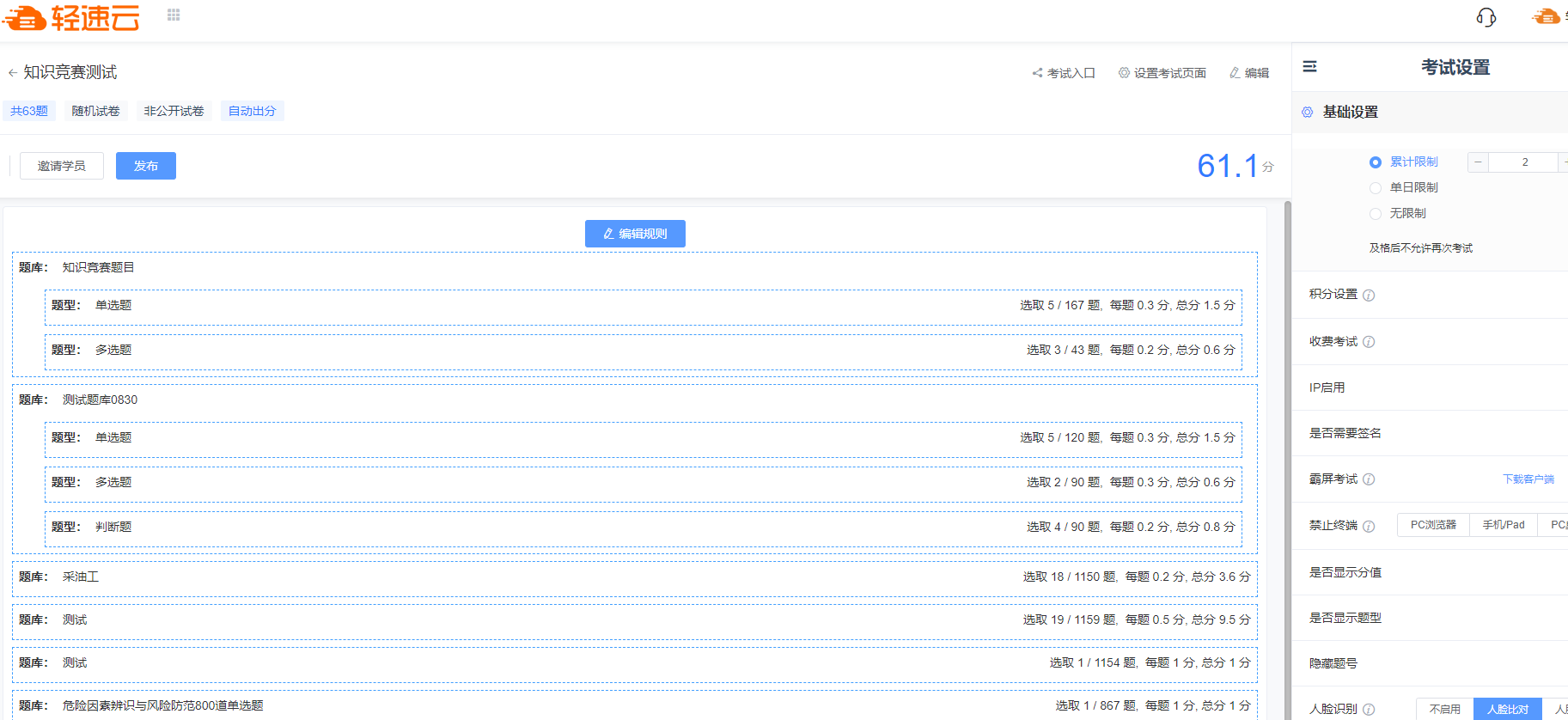 - 功能丰富:轻速云支持多种题型,包括选择题、填空题、简答题等,还可以进行在线监考、自动阅卷等功能。