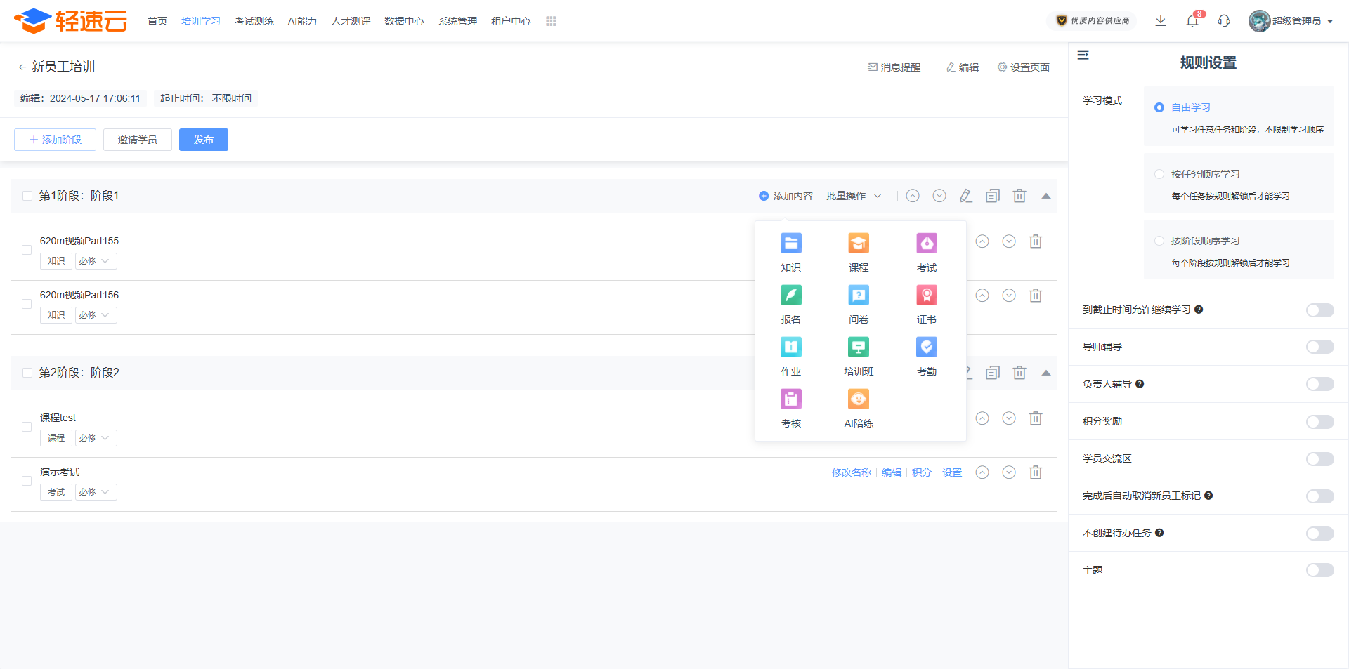 在培训准备阶段,培训管理员可以轻松利用轻速云创建专属的新员工培训计划。轻速云支持按岗位或部门灵活配置差异化的学习内容,并能将新员工标记出来,实现学习任务的自动推送。这意味着新员工在入职第一天就能清晰地看到自己的学习路径,无需HR手动催促,极大提升了新员工培训的管理效率。