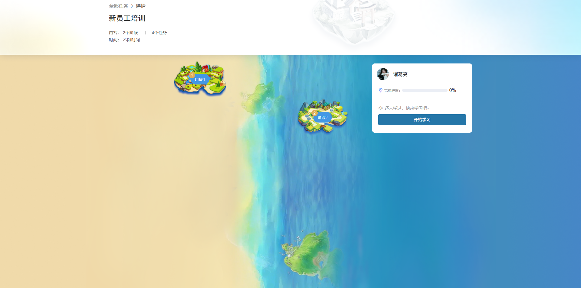 在岗位技能培训与团队协作培训等核心环节,轻速云新员工培训模块中的“任务解锁”或“阶段解锁”功能可以引导新员工循序渐进地学习,只有完成前一个任务或者阶段后,才能解锁下一个任务或者阶段。这个过程旨在帮助新员工巩固业务知识,敦促其认真学习,不单单是仅仅为了完成学习任务。