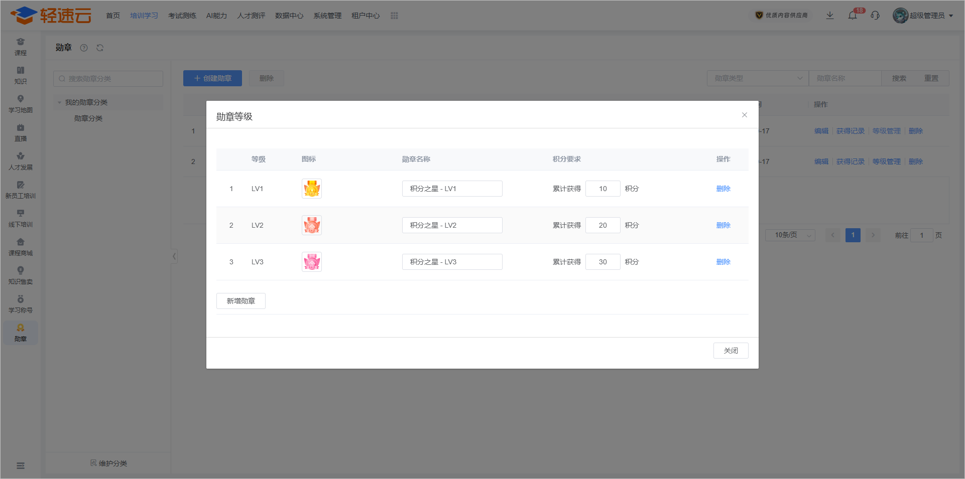 新增勋章功能,在学员达成勋章获取条件时,可以获得对应勋章。目前勋章支持按照学习时长或积分来获取。