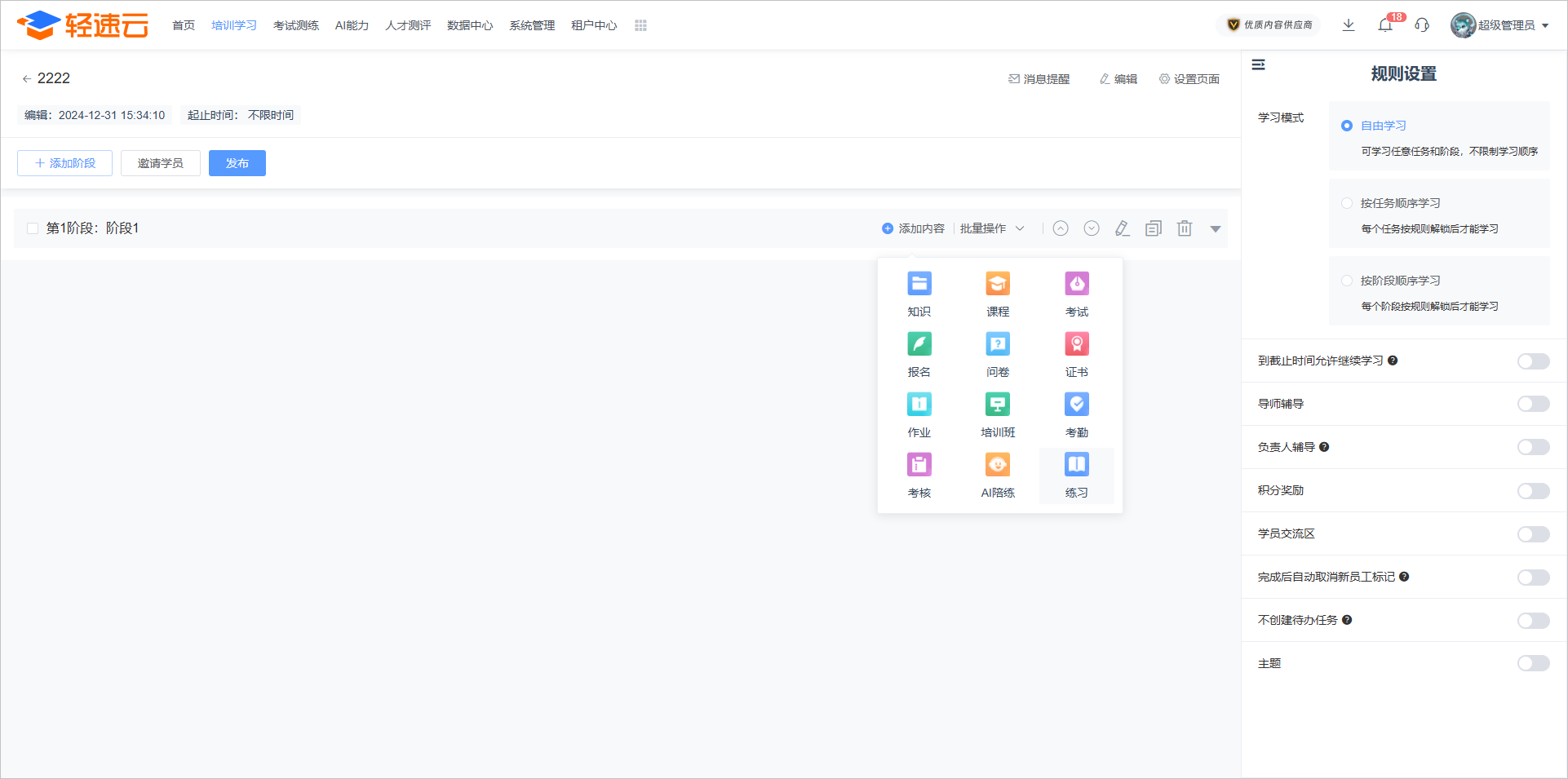 轻速云是行业领先的数智化培训和人才发展平台,围绕企业新员工培训、人才发展与测评、智能考试与答题、专业技能培训、领导力发展、合规与安全等多元培训场景,提供AI深度融合的一体化平台与海量优质课程资源,通过智能化手段全面提升企业培训组织效率、大幅降低培训组织成本。