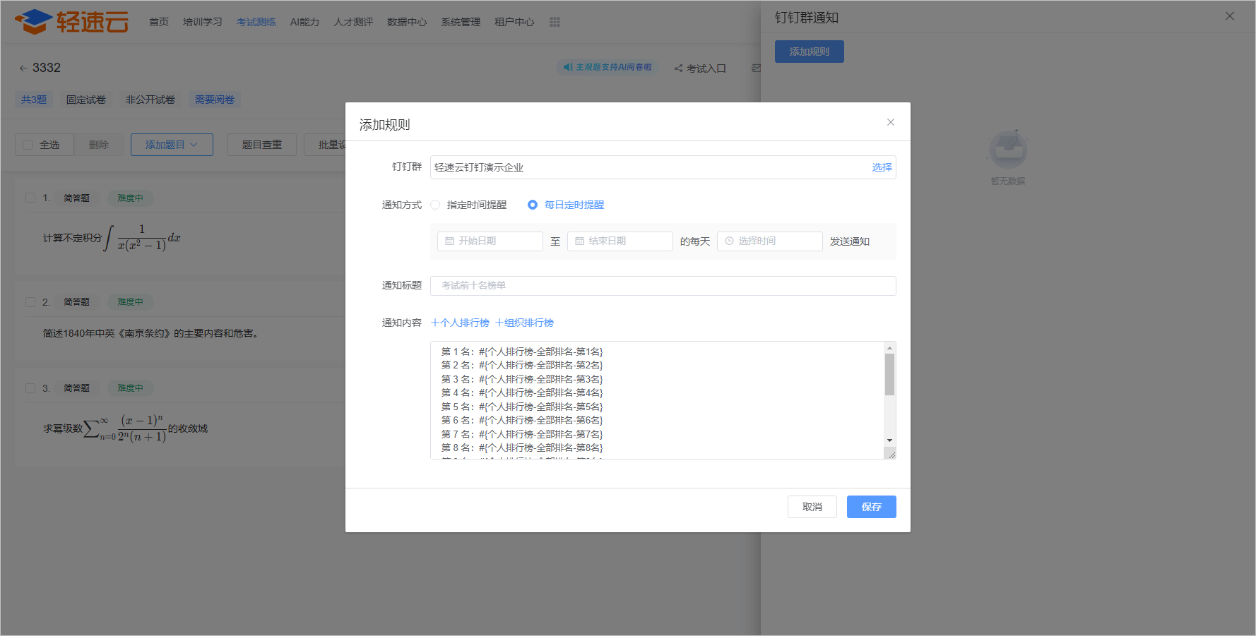在钉钉中打开管理端时,考试设置的排行榜相关设置中可以找到「排行榜推送到钉钉群」功能。启用后,机器人会在指定的触发时机在预设的钉钉聊天群里推送当前的排行榜排名信息。