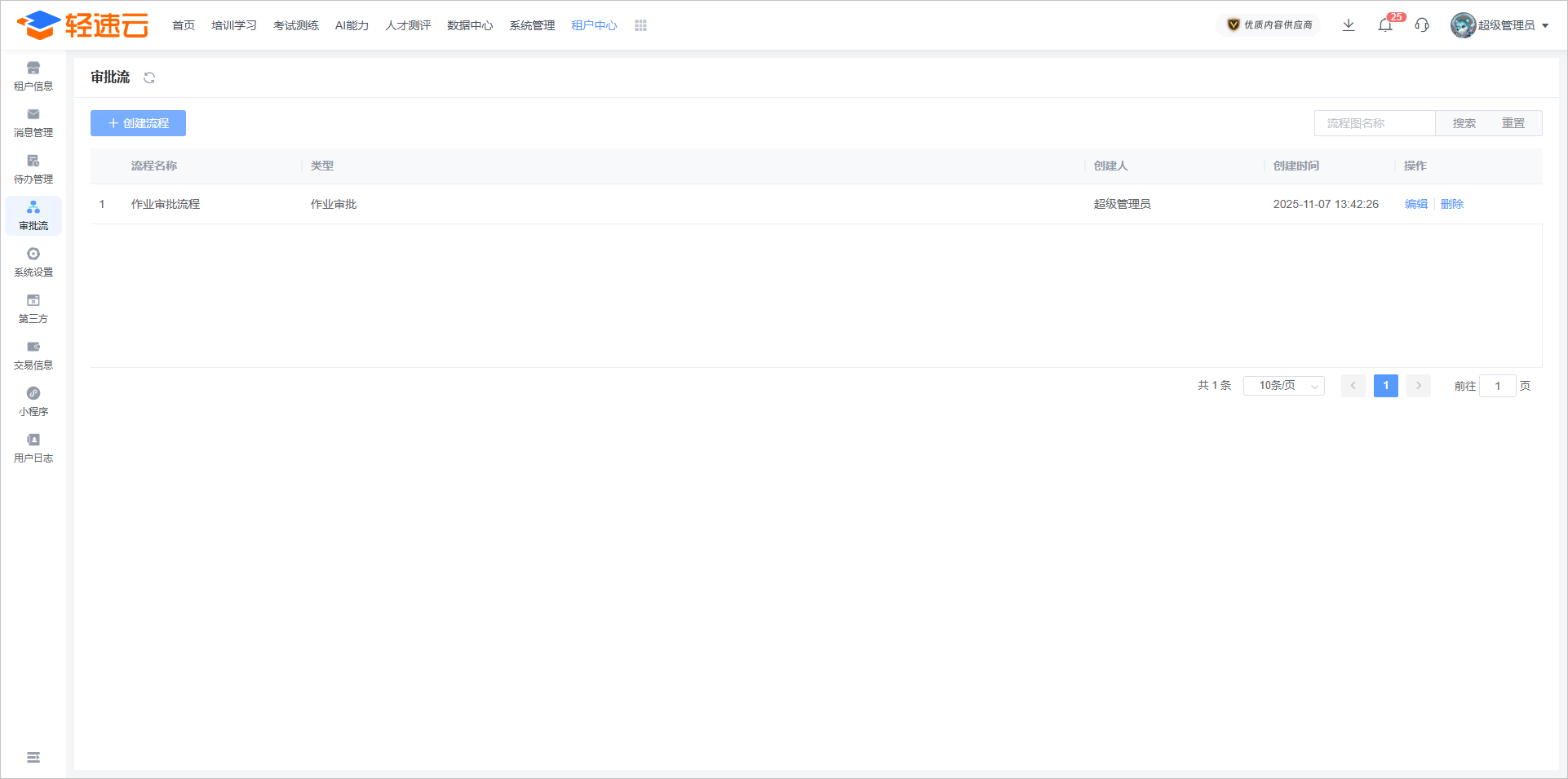 通过管理端「租户中心」-「审批流」页面可以配置审批流程,已配置的流程在设置审批任务时可以被关联使用。
