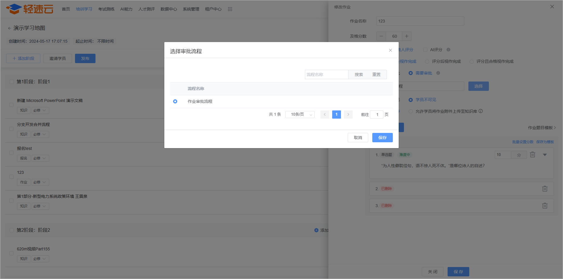 学习地图与新员工培训中添加的作业任务,增加审批流程与对应的消息提醒功能。