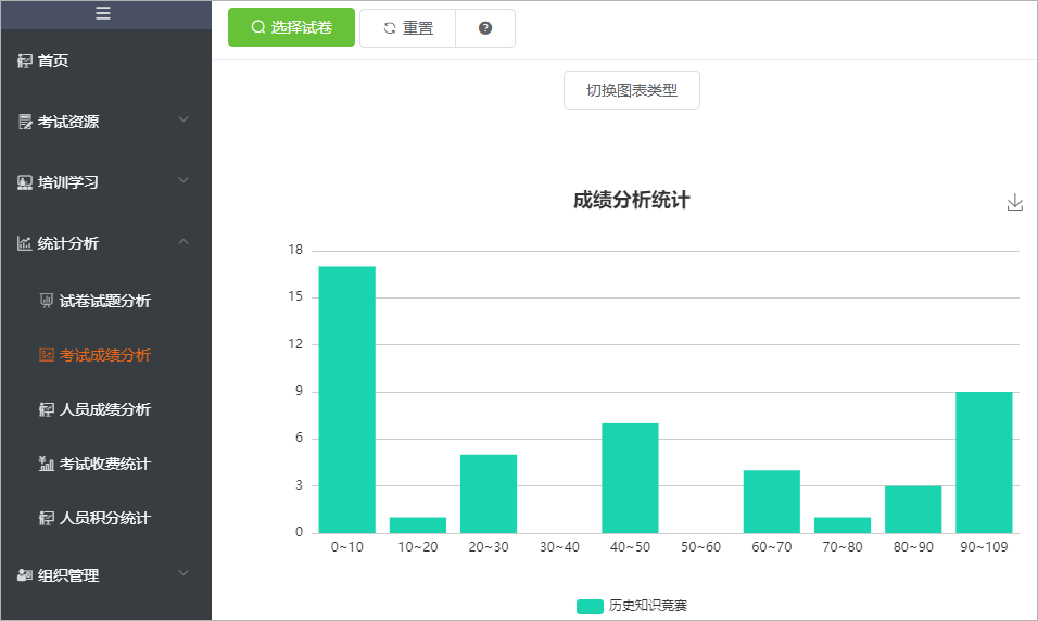 通过“考试成绩分析”功能,选择一个需要进行统计分析的试卷,系统将以图表的形式列举出每个成绩段的人数。