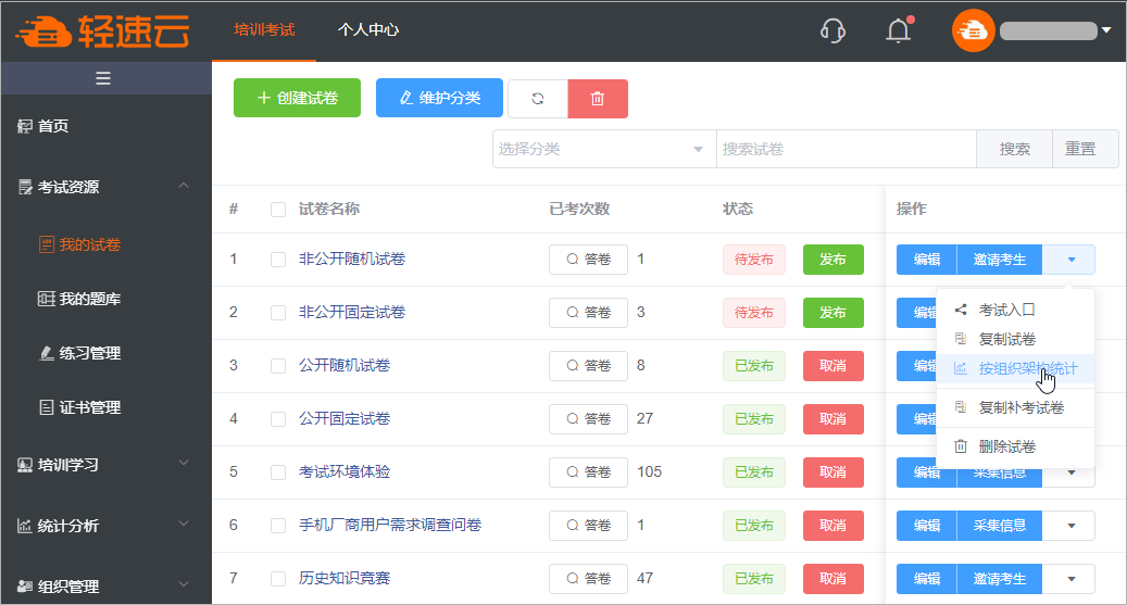在“我的试卷”界面下找到需要进行分析的试卷,点击右侧的下拉菜单小箭头,然后选择“按组织架构统计”即可。