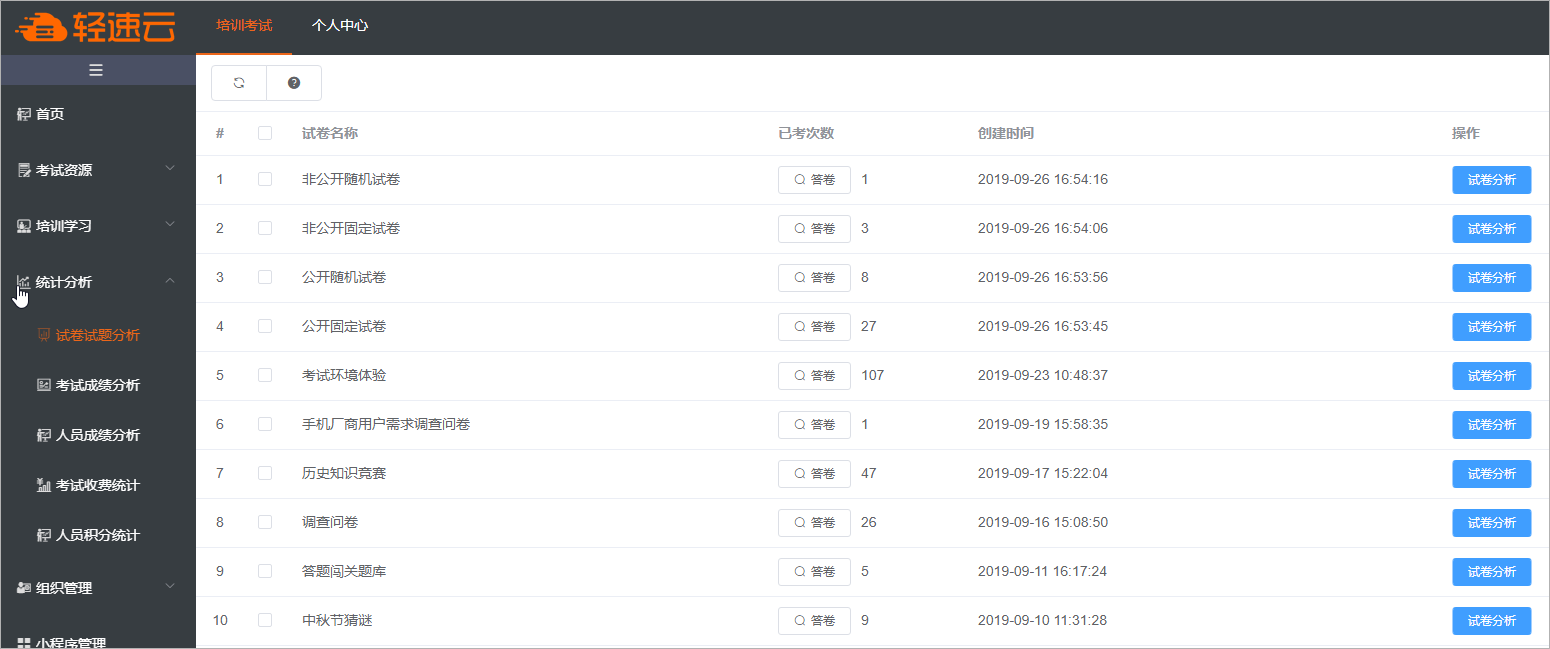 考试结束后,轻速云在线考试系统提供了多种分析方式,方便管理员从不同的角度来分析考试成绩。