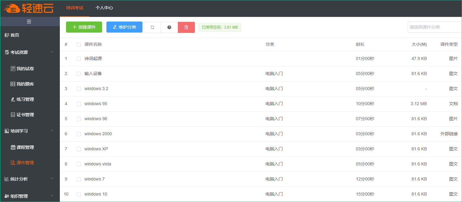 在轻速云培训学习功能菜单下,给用户提供了课程设计的完整功能。