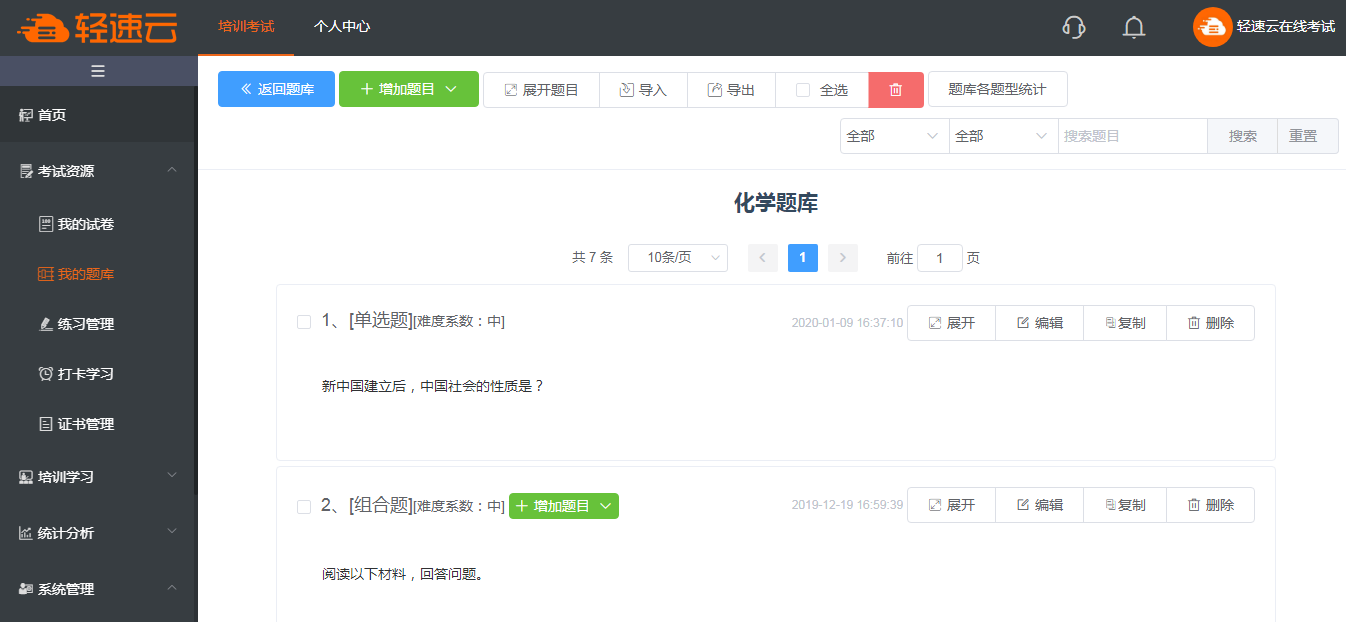 第一步,我们在题库中编辑添加已经拟好的题目,如果没有题库可以创建一个,如果题库中题目数量足够多能够直接使用,那么可以跳过这一步骤。