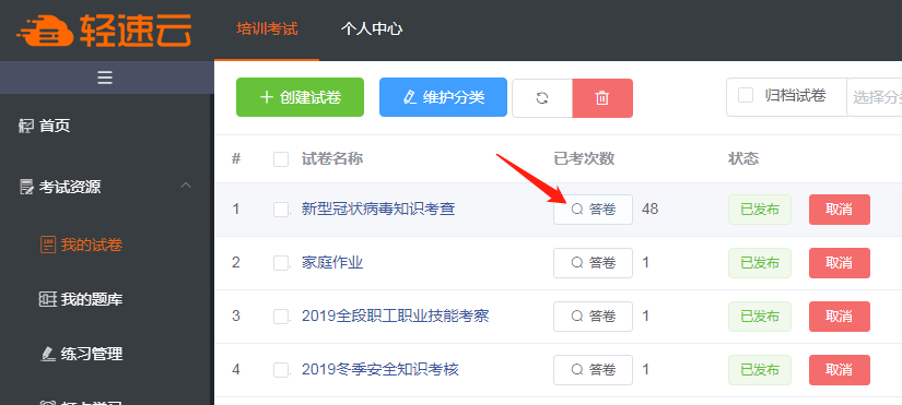 在试卷作答完毕后,管理员登录后台,可以在“我的试卷”中查看到试卷对应的答卷信息。