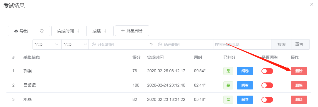 列表中每份答卷都是互相独立的,如果要删除某份答卷,只要点击与答案对应的“删除”按钮即可。