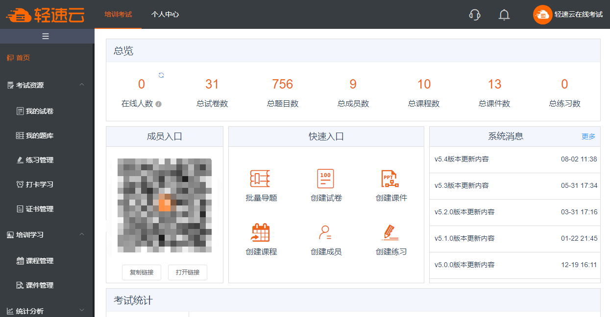 接下来使用新注册的帐号和密码登录到在线考试系统的管理后台,就可以开始正式的试用了。通常在试用期间内,所有的功能都是开放的,用户可以自由体验尝试。