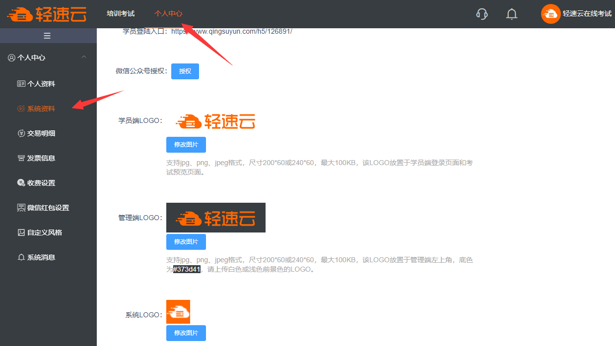 第三步,配置和定义机构细节信息。点击左上角的【个人中心】,然后再点击【系统资料】,可以进行界面logo图标的替换,制作在线考试系统,机构专属的清晰醒目的图标当然是必不可少的。根据系统要求上传指定图片即可完成设置。除此之外,还可以点击【自定义风格】来配置考试的背景图,这样就完成了初级界面内容的设定。