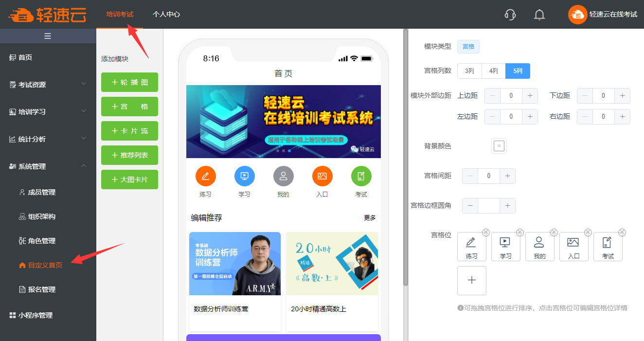 第四步,配置机构首页。点击【培训考试-系统管理-自定义首页】,可以找到很多的首页功能模块。使用各种功能模块来设置机构专属的自定义首页。点击已经添加到预览区的自定义首页模块后,更是能够进行很多更深入的功能设置。