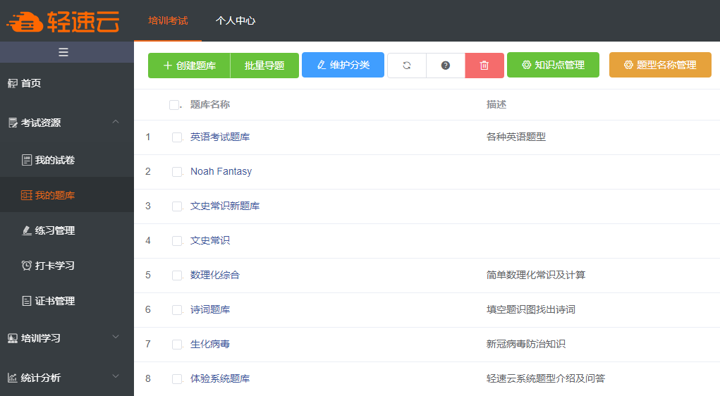 第五步,添加考试题库。组织在线考试过程中需要从题库中选题组卷,所以充实题库才能够便于日后在线考试。在线考试系统支持在线编辑、批量添加、文档导入等多种方式来添加题库,十分方便。