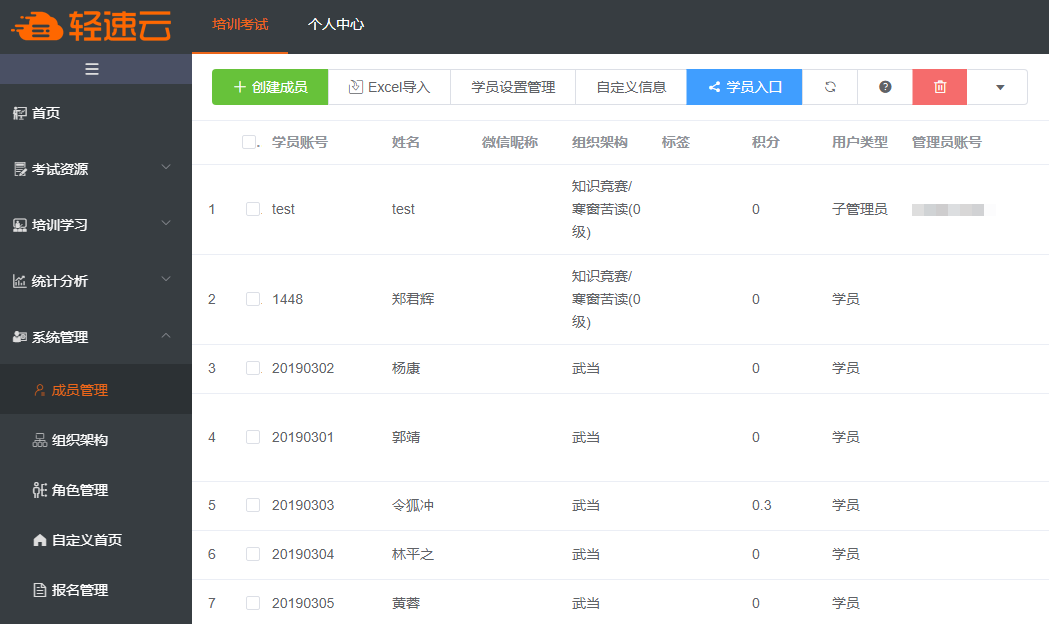 第六步,在线考试需要有考生参加,为了让考生答卷与考生本人一一对应,因此每个考生需要有一个独立的帐号用来登录和参加考试。使用【系统管理-成员管理】功能可以添加考生信息,也可以直接导入包含考生信息的Excel表格来快速录入多个考生信息。除此之外,管理员使用【报名管理】功能,也能够让考生通过自主报名来获得用于考试的帐号。