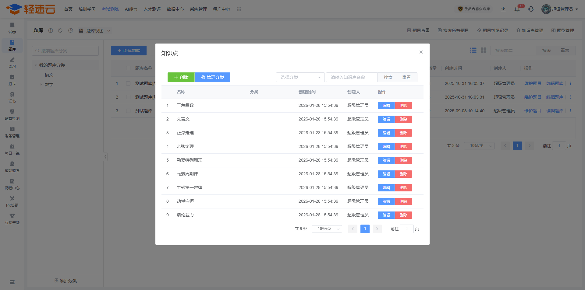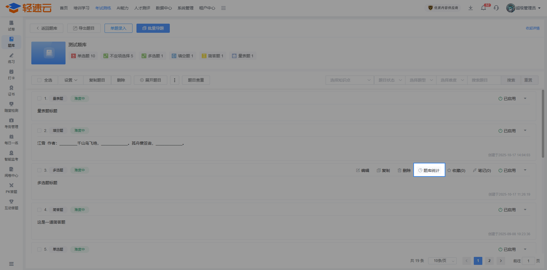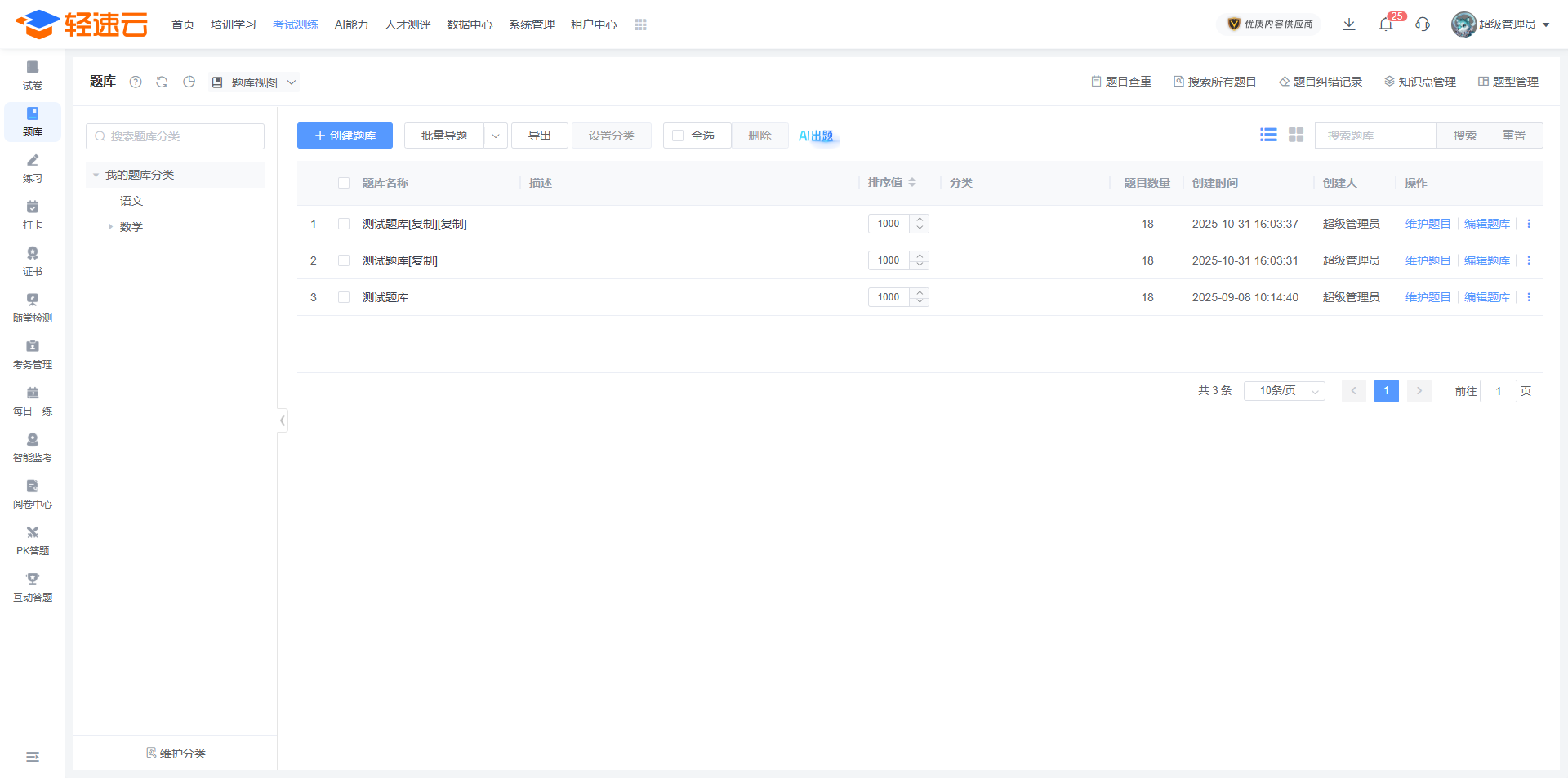 在题库列表中,能够对已创建的题库进行维护、编辑以及删除操作。