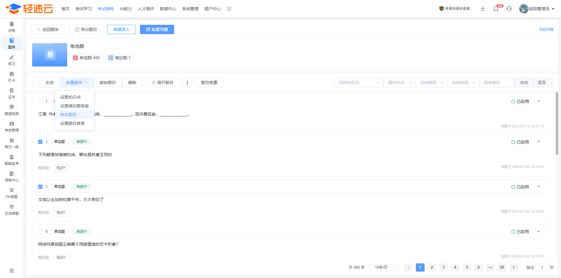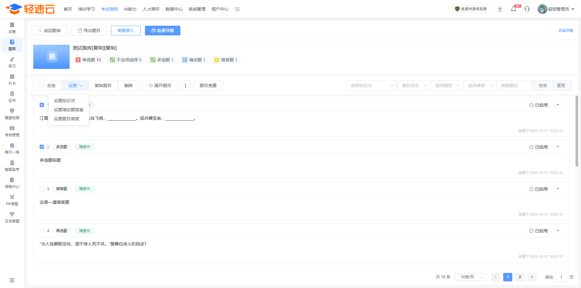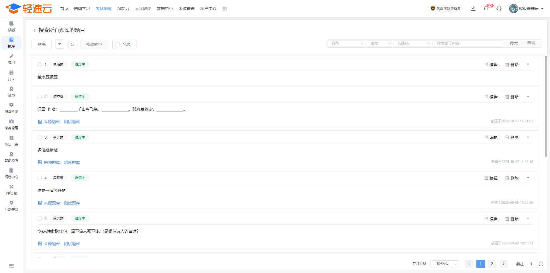 在题库列表中,能够对已创建的题库进行维护、编辑以及删除操作。