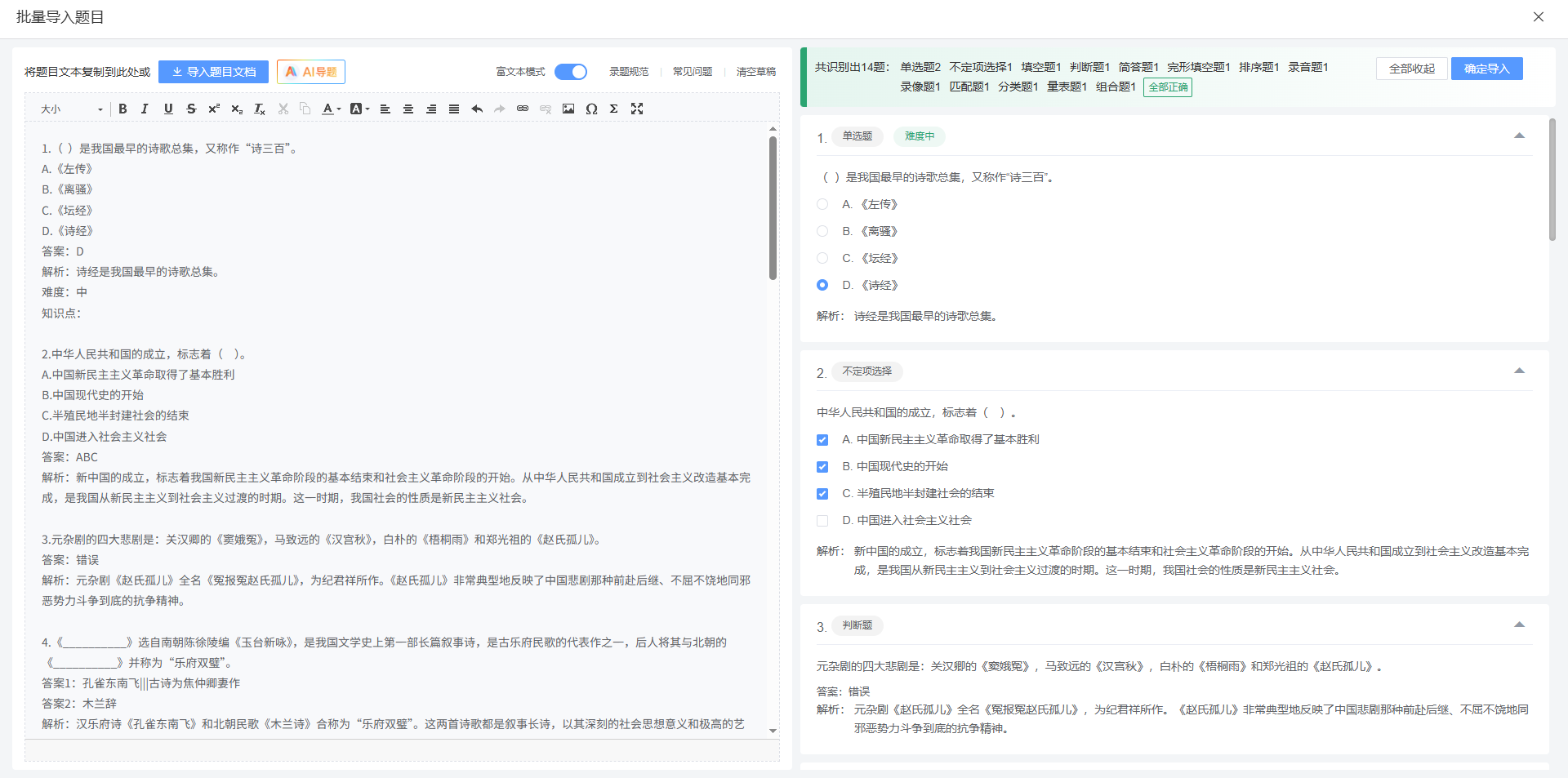 在维护题目主界面点击 批量导题 则弹出批量导题界面。您可以将题目信息复制到左侧的输入区或导入本地文档,系统会开始自动识别。识别结束后,会在右侧的解析区反馈结果。
