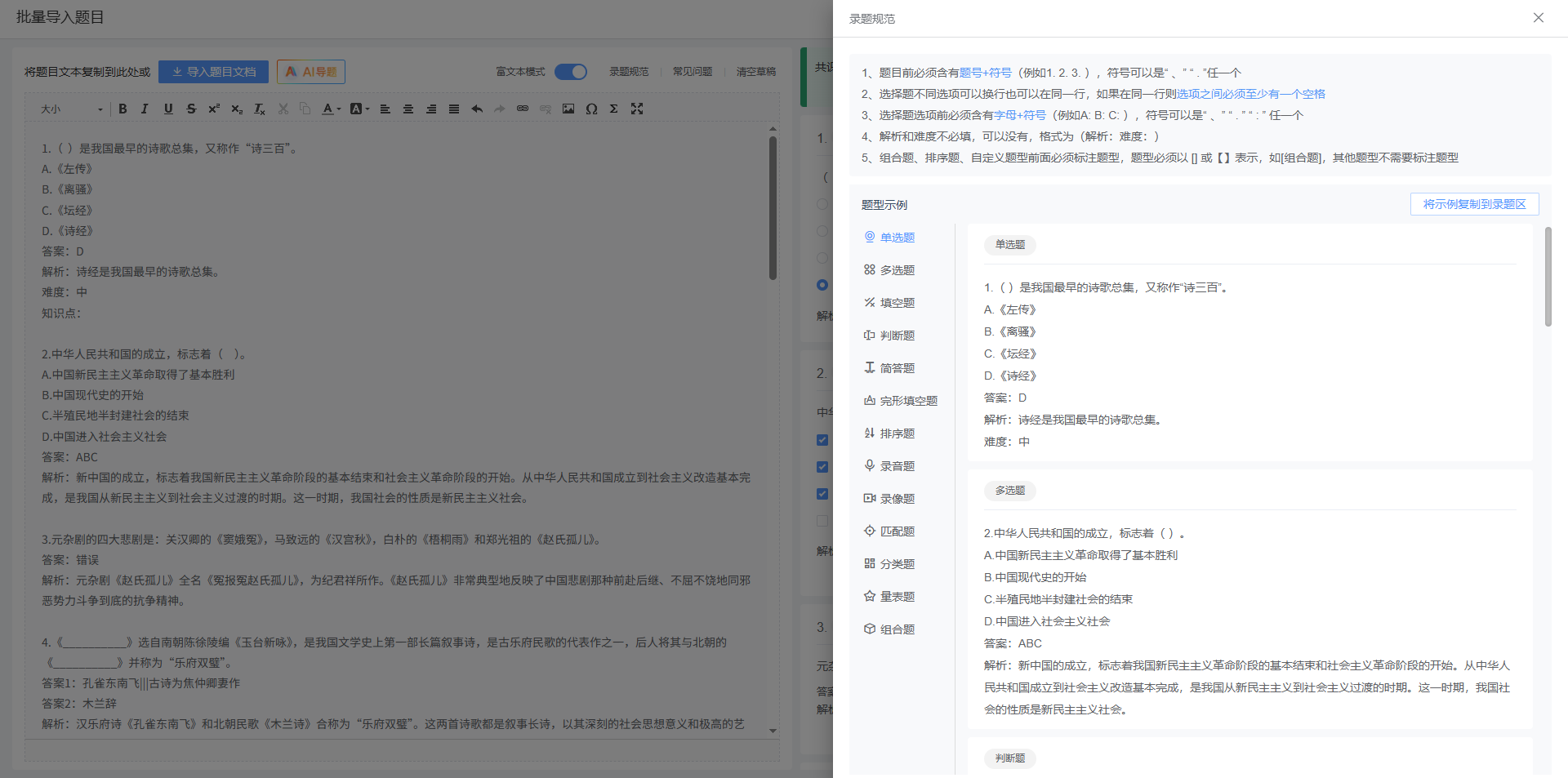 在批量导入题目时,如果存在自定义题型标记,系统也会正常解析识别自定义题型。
