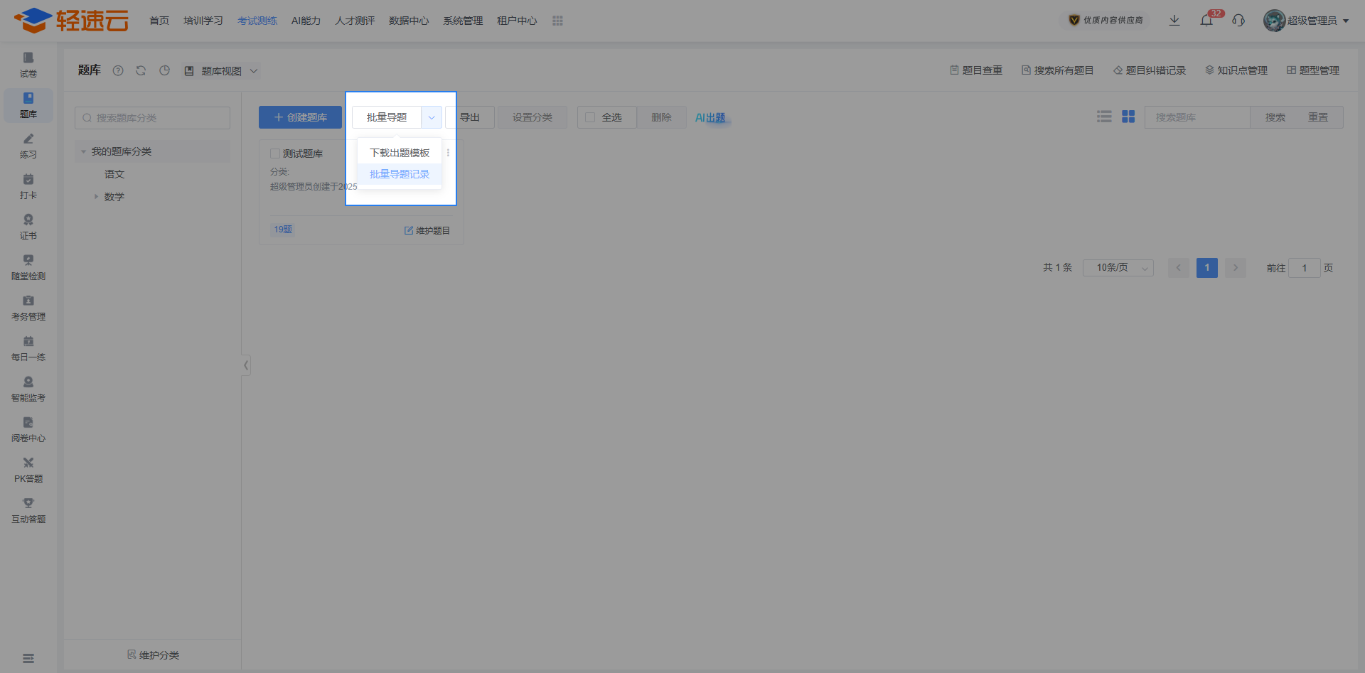 登录到系统后台,在 考试测练 栏目下可以找到 题库 菜单,已创建的题库信息会在列表中进行展示。