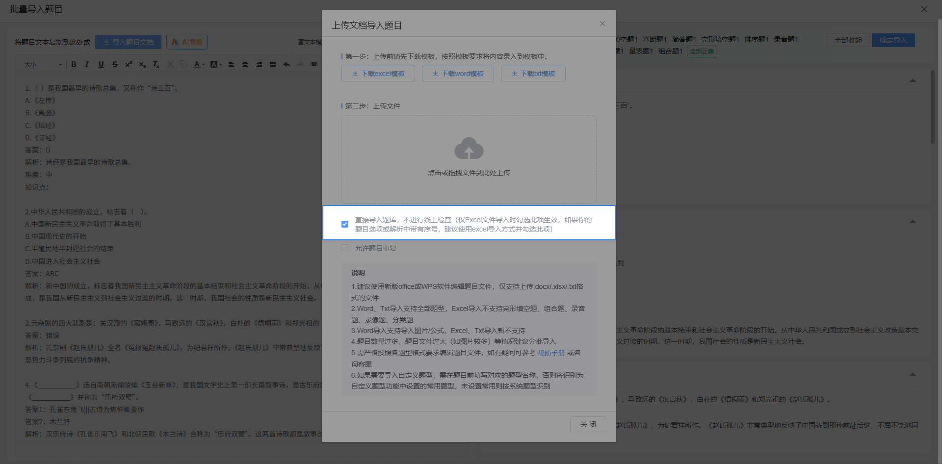 在某个题库中使用批量导题功能时,如果确认题目文档格式无误,则可以勾选 直接导入题库 按钮跳过格式预检,这种方式仅支持Excel。