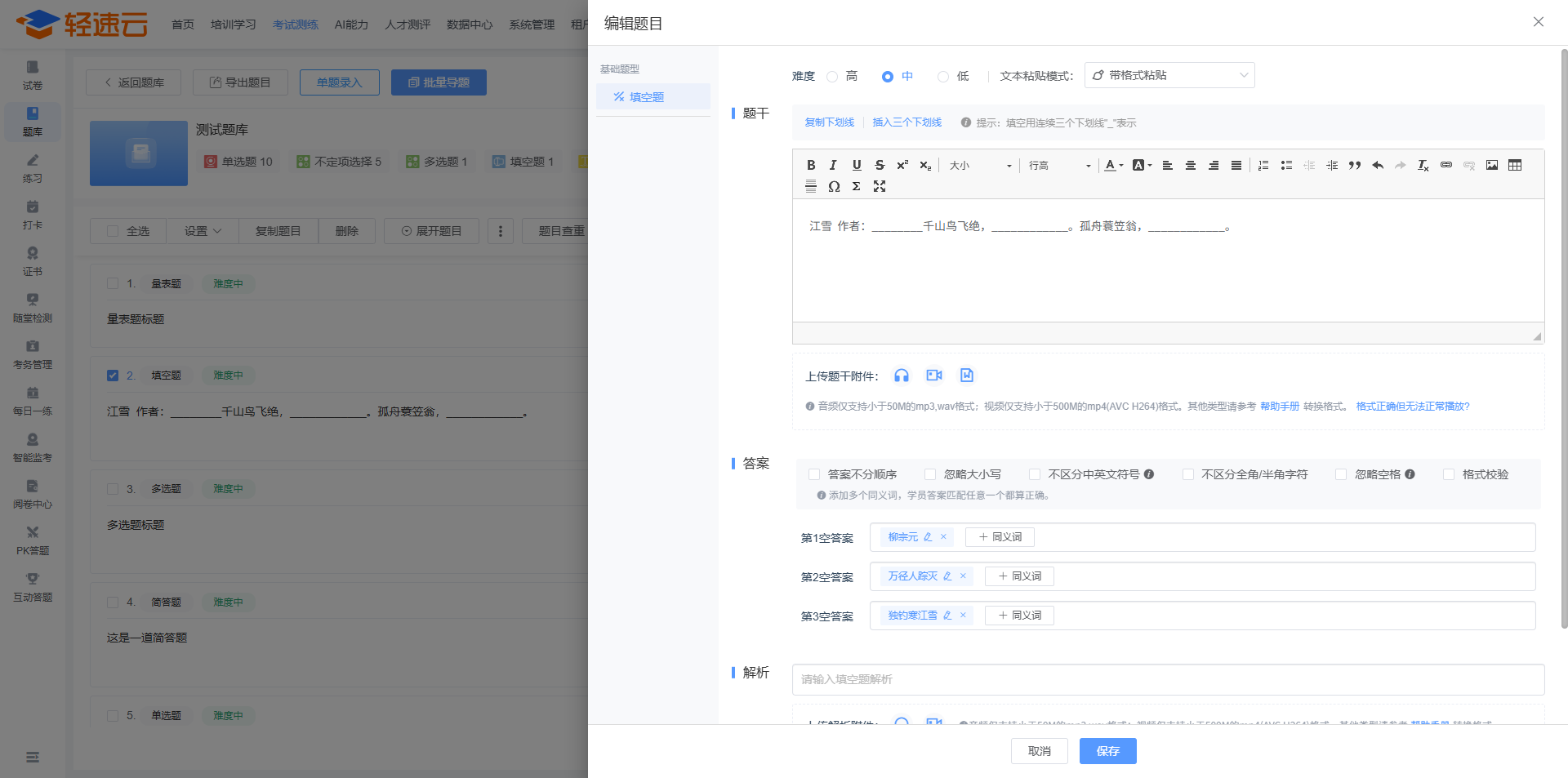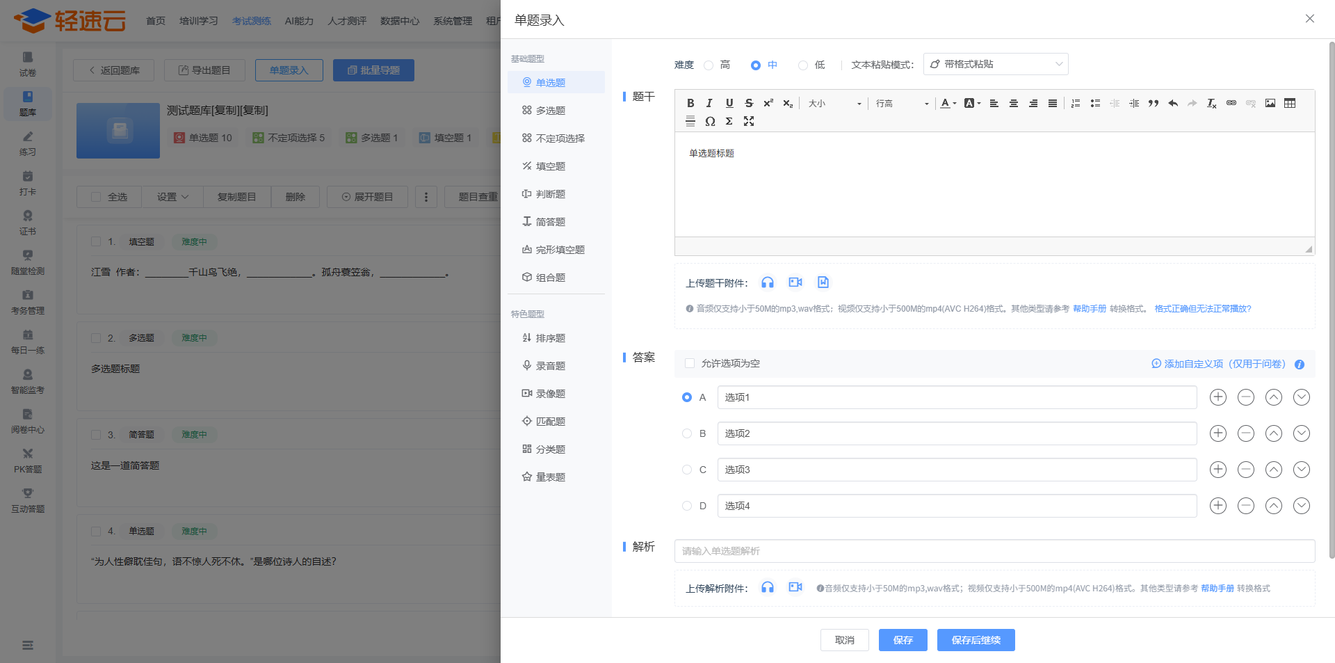 题干与解析部分支持上传附件,附件类型包括音视频附件与普通文档类附件。