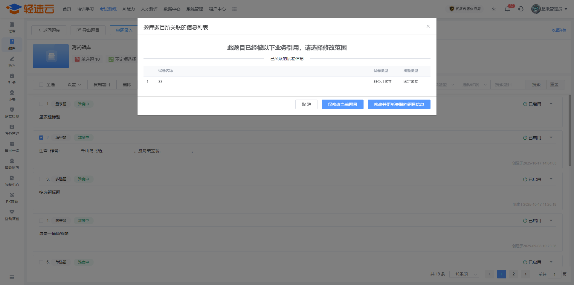 修改题目后,系统会自动查询该题目被其他功能关联使用的情况。如果编辑修改的题目已经被使用,则弹出关联信息列表(最多显示10条),您可根据实际的使用需求确定更新内容。