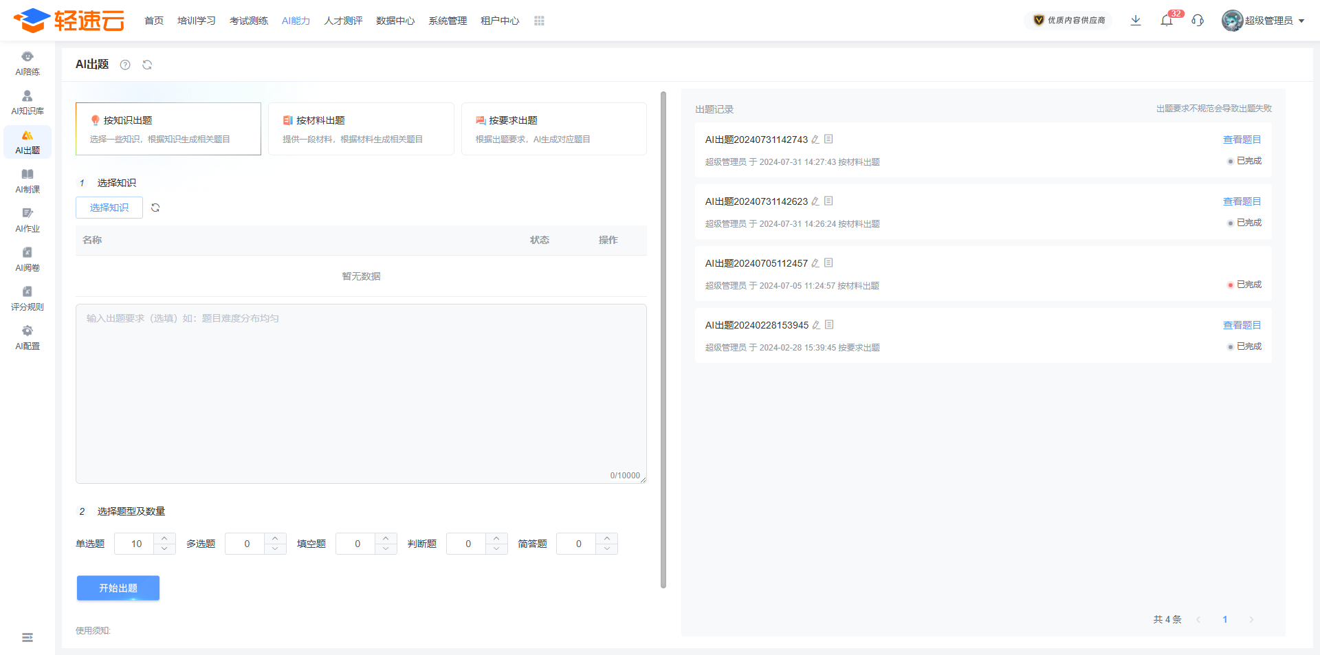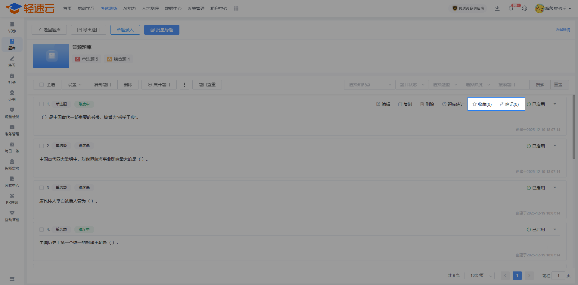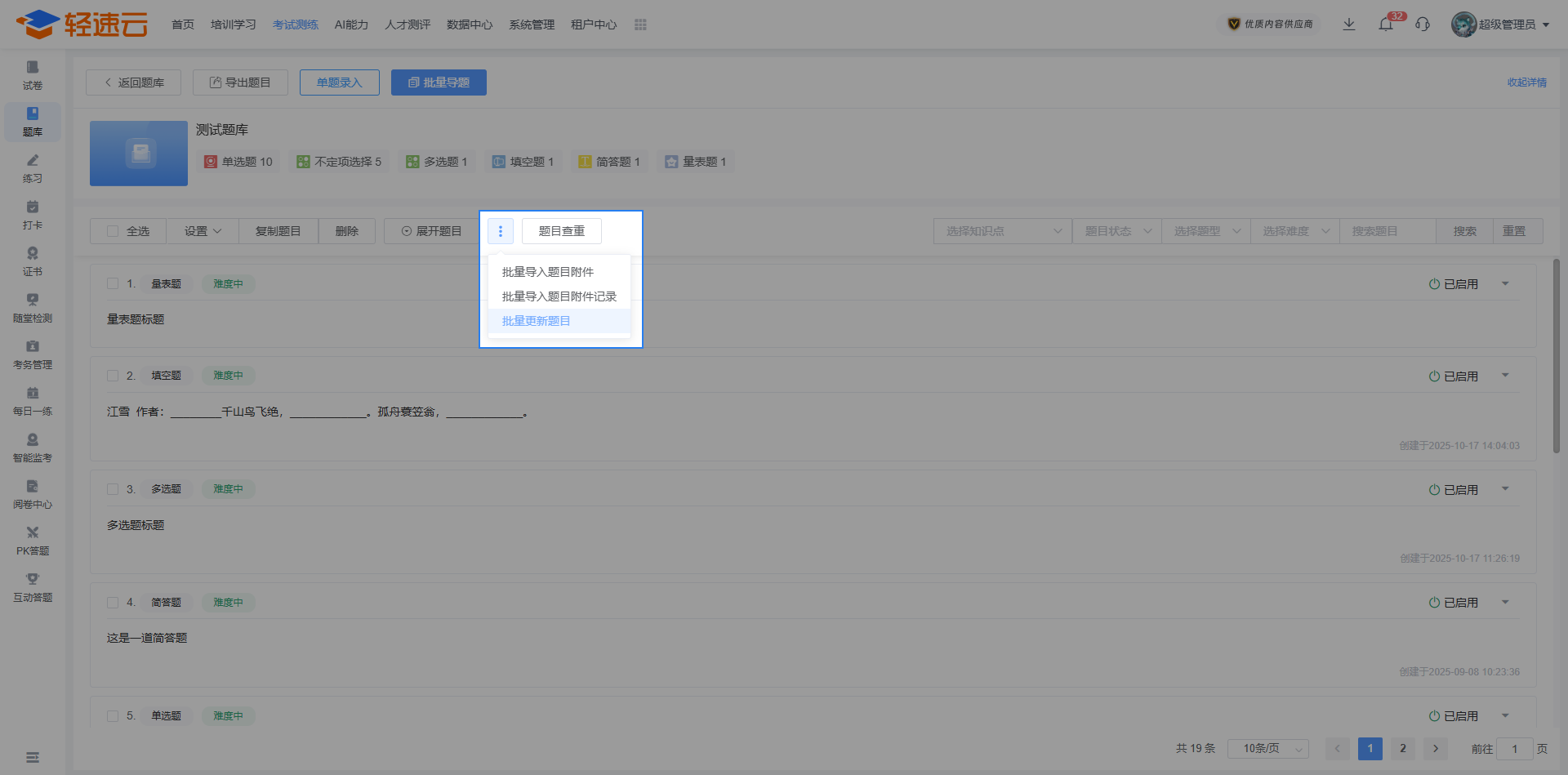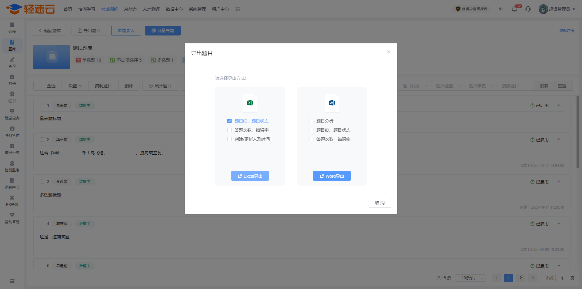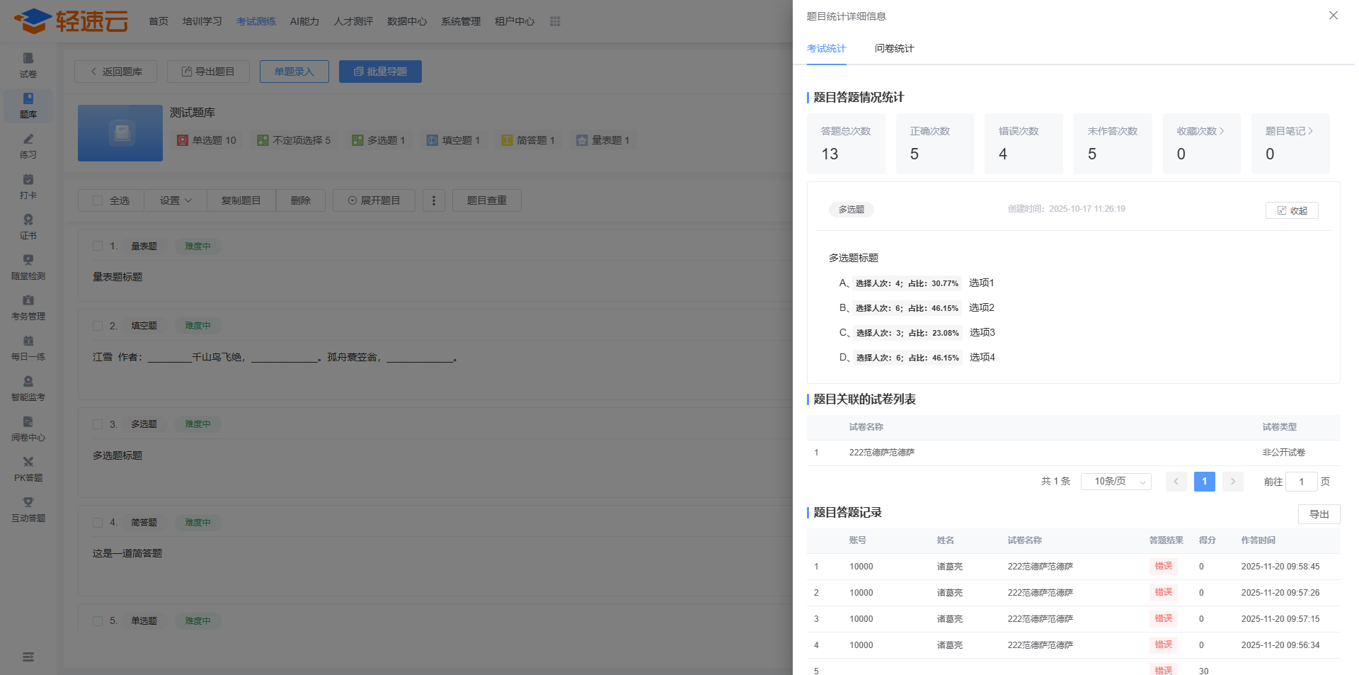 题库是轻速云在线培训考试系统的基础核心数据之一,用来保存题目信息,包括考试、练习在内的多个主要功能都需要引用题库中的题目。