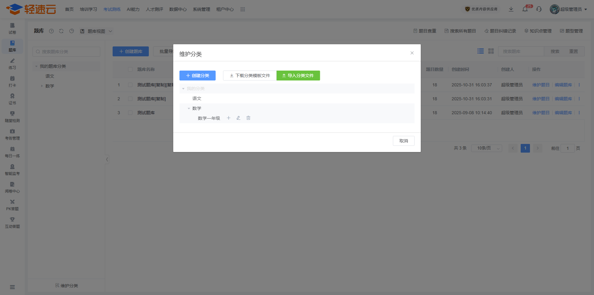 点击页面上 维护分类 按钮会弹出分类编辑窗口,您可以自由创建或导入分类信息。将鼠标悬停在已创建的题库分类上,会出现三项题库分类的相关操作,分别为:创建子级分类、编辑本级分类、删除本级分类。