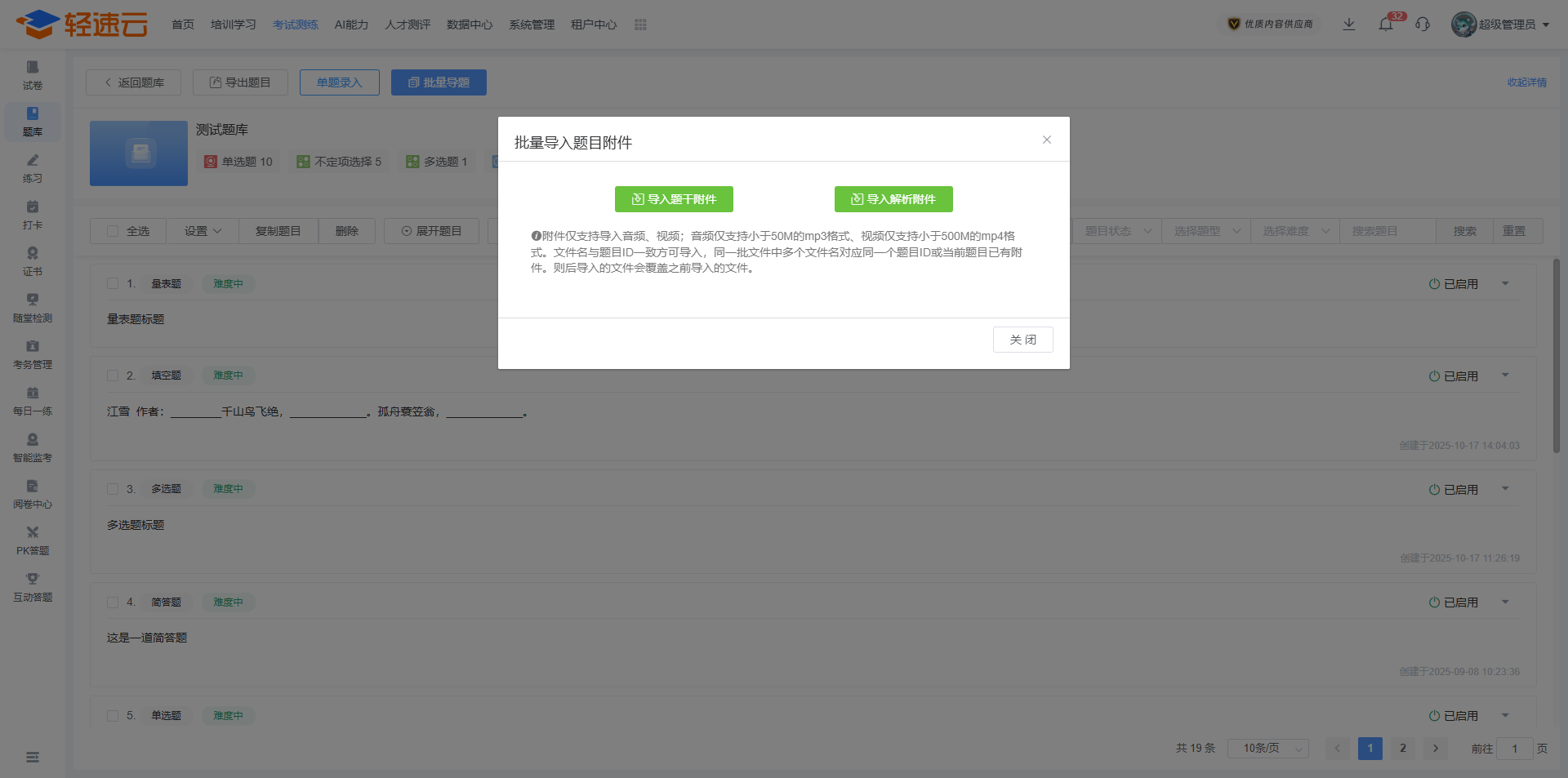 批量导入题目附件仅支持mp3和mp4文件。