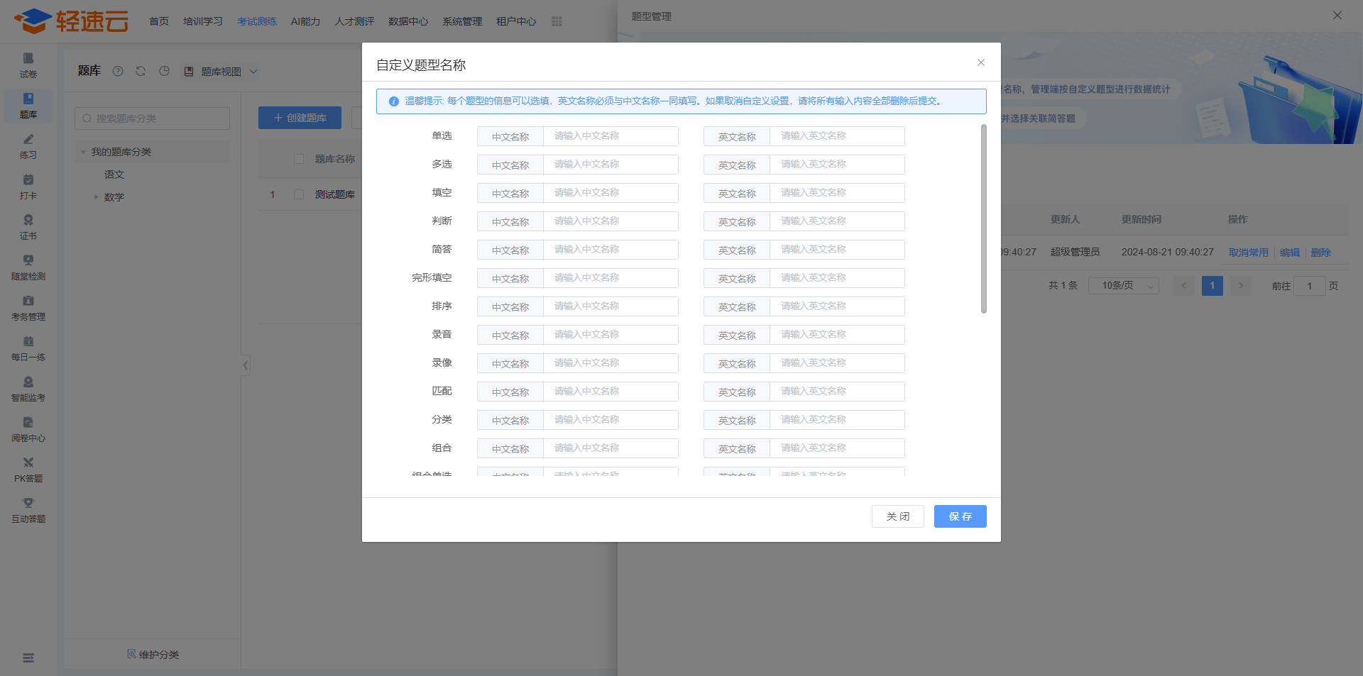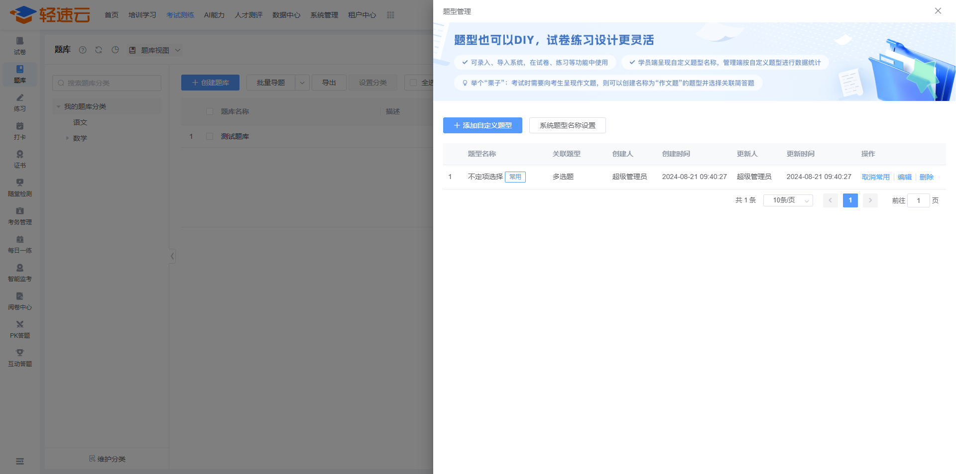 系统支持自定义题型,管理员能够在不变更真实题型的基础上修改现有题型的展示名称,或直接创建全新的自定义题型。