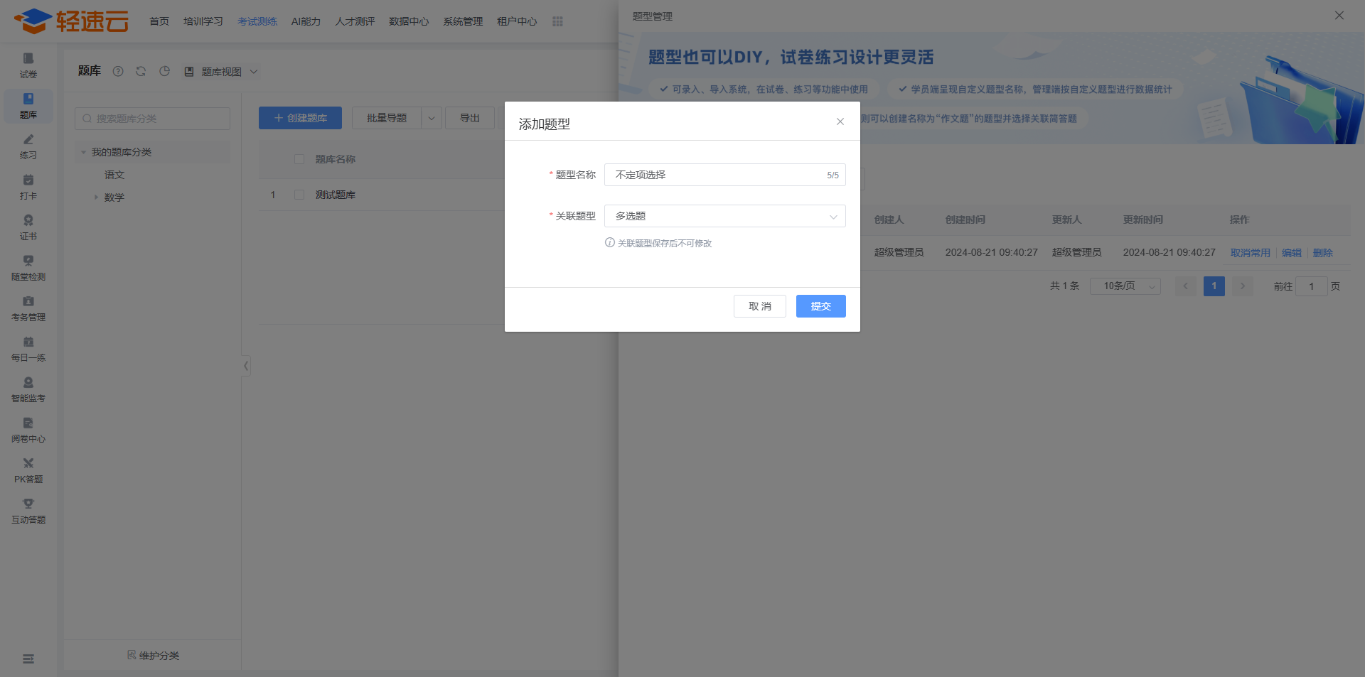 在题库列表点击右上角 题型管理 按钮,能够创建全新的自定义题型。自定义题型需以基础题型为模板,设置完成后,在创建对应题型时,系统会将其识别为自定义题型。