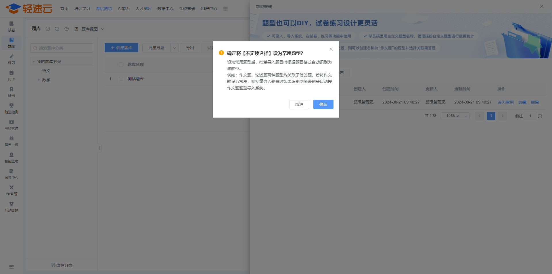 创建自定义题型时,能够将某种自定义题型设置为常用题型。通过批量导题解析识别题目格式时,若不存在题型标记且格式正确,则系统会将该题目解析为自定义题型。
