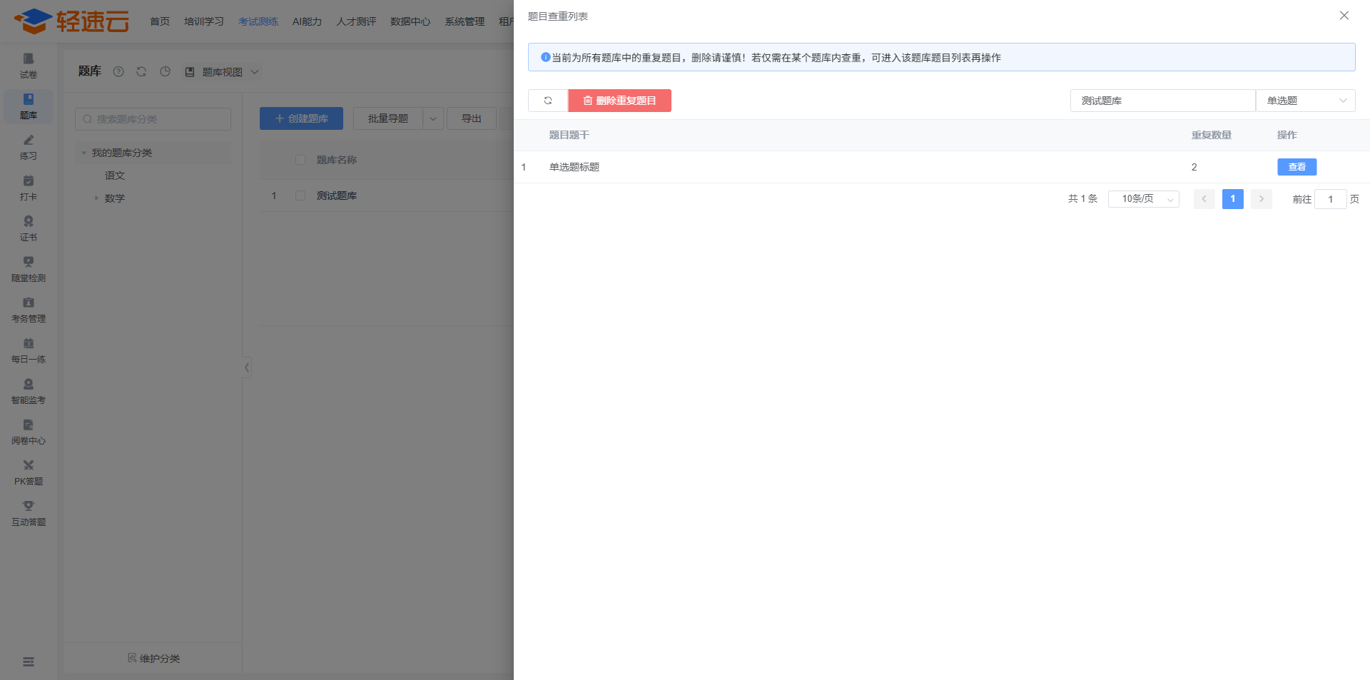 若使用一键批量删除,则系统会将各个题库中的重复题目随机删除,最终仅保留一道。建议查看重复明细后手动删除。