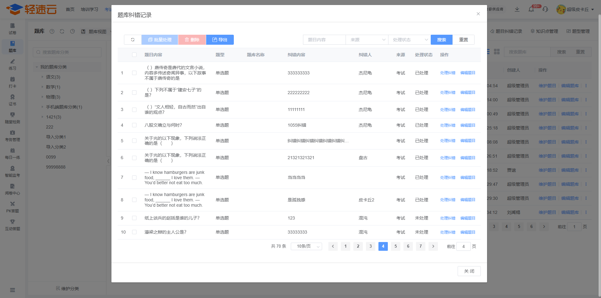在 我的题库 页面下,点击顶部的 题目纠错记录 可查看成员提交的题目纠错信息。