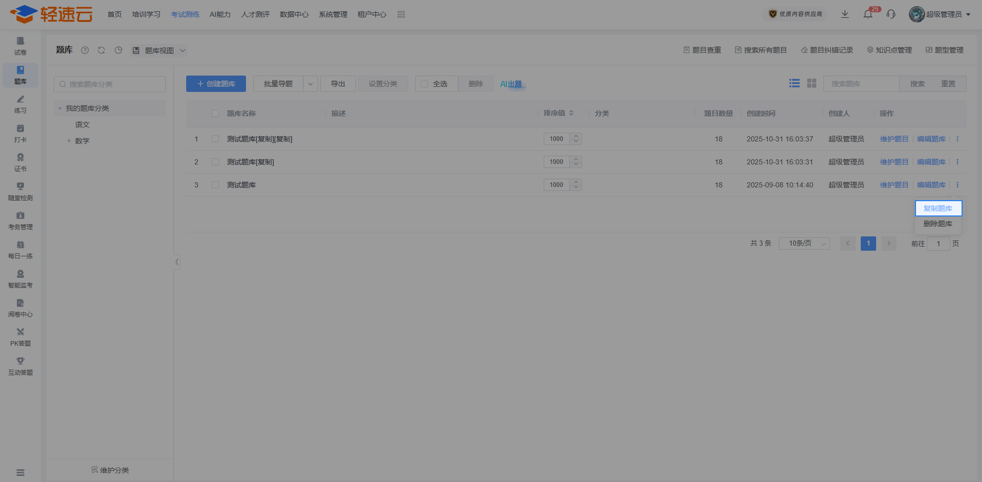 系统支持对某个题库进行整体复制。点击某个题库对应的 ┇ 按钮并选择 复制题库 ,能够进行题库复制操作。