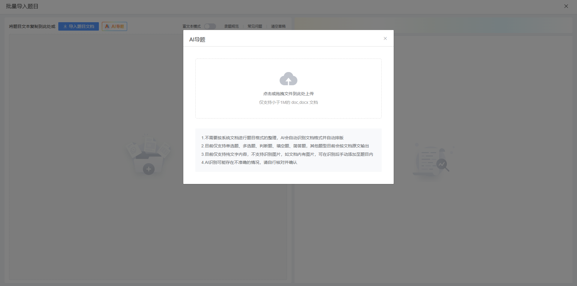 批量导题时如果使用word类文件,可以选择 AI导题 的方式进行导入。AI会识别文档中的题目内容,并根据格式要求来修改题目格式,使其满足导入要求。