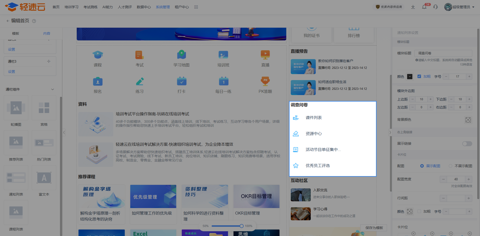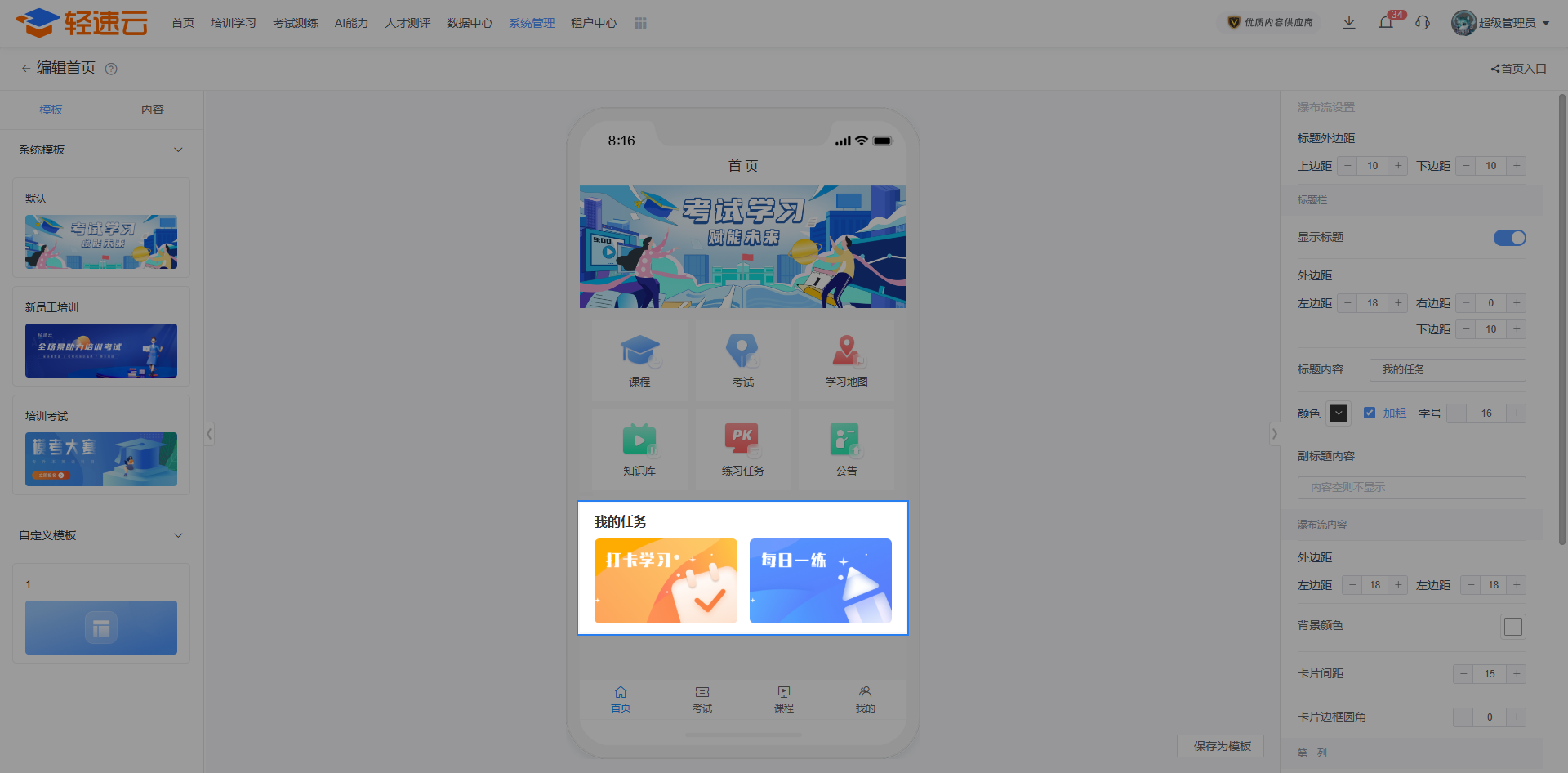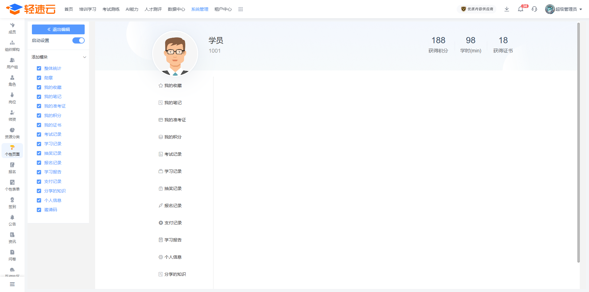 管理员可以编写欢迎页的文本内容,引用的姓名和组织架构信息,将根据学员的实际信息予以展示。