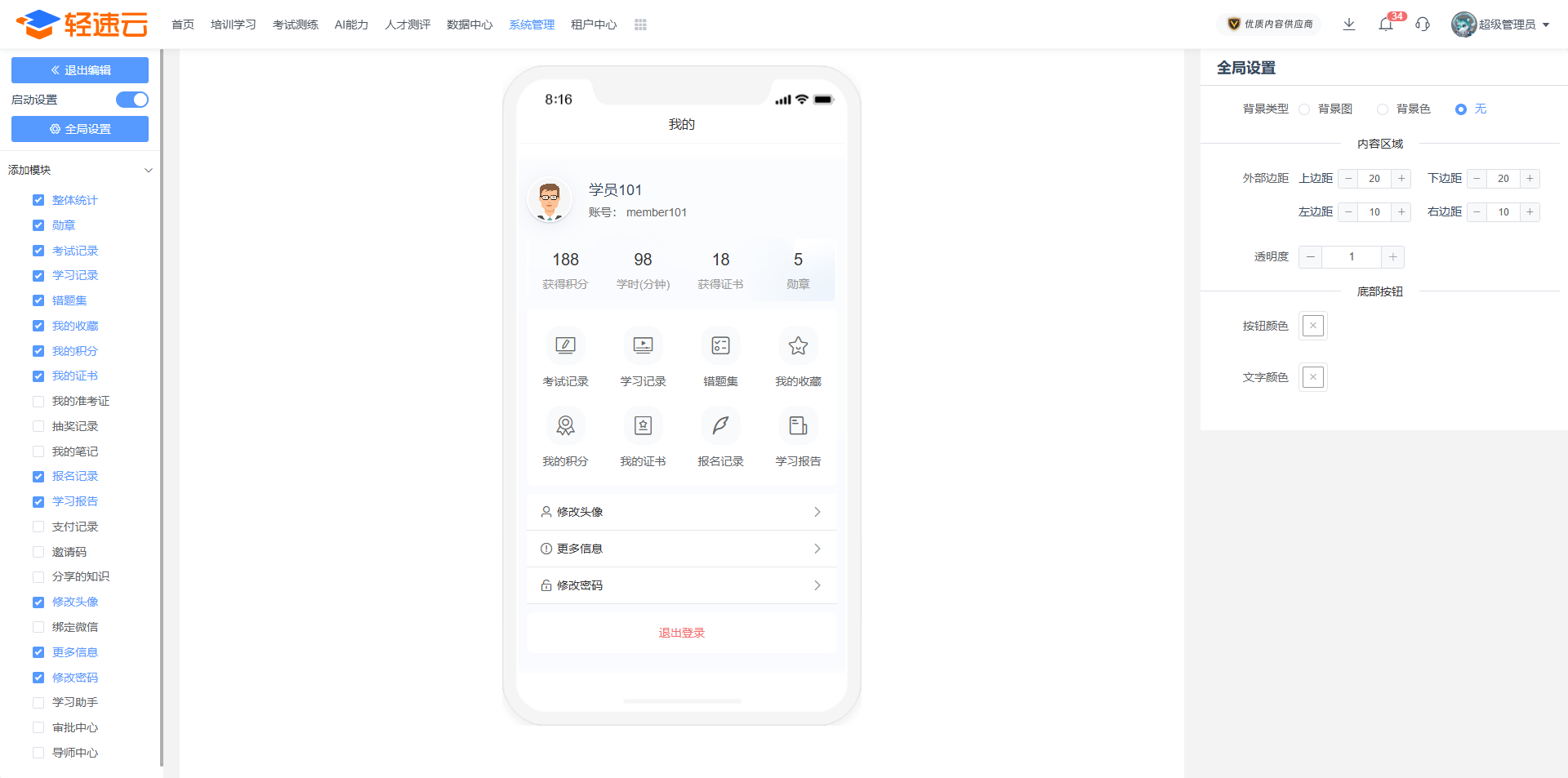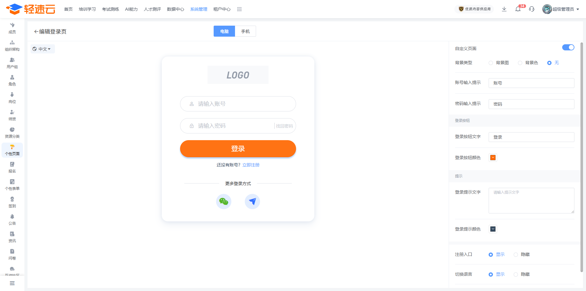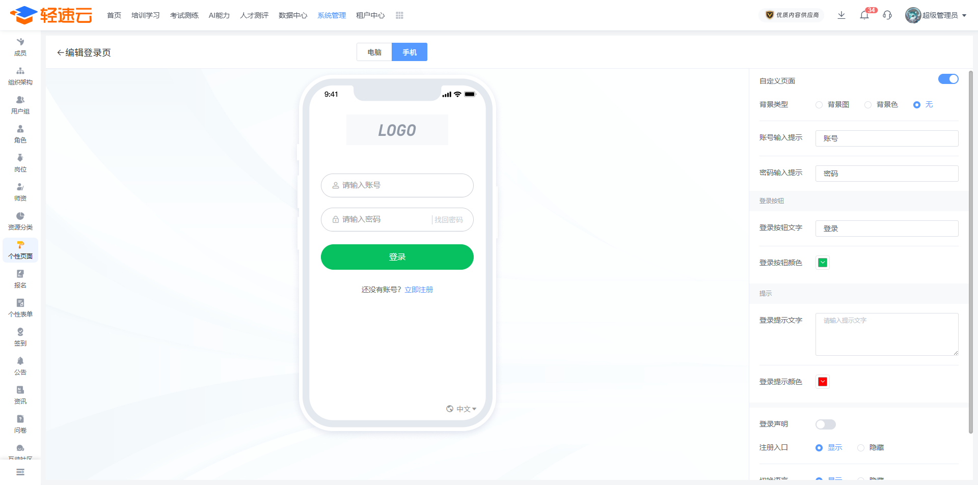 轻速云支持您自定义大多数成员端页面,通过不同的设置入口,您可分别设置对应的页面展示效果。登录到管理后台,通过 系统管理 栏目中的 个性页面 菜单会进入到各类自定义页面的设置列表。