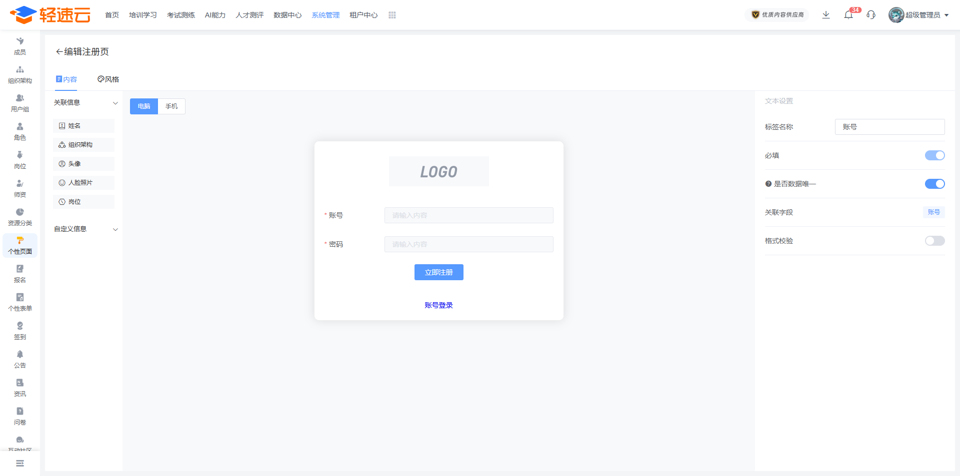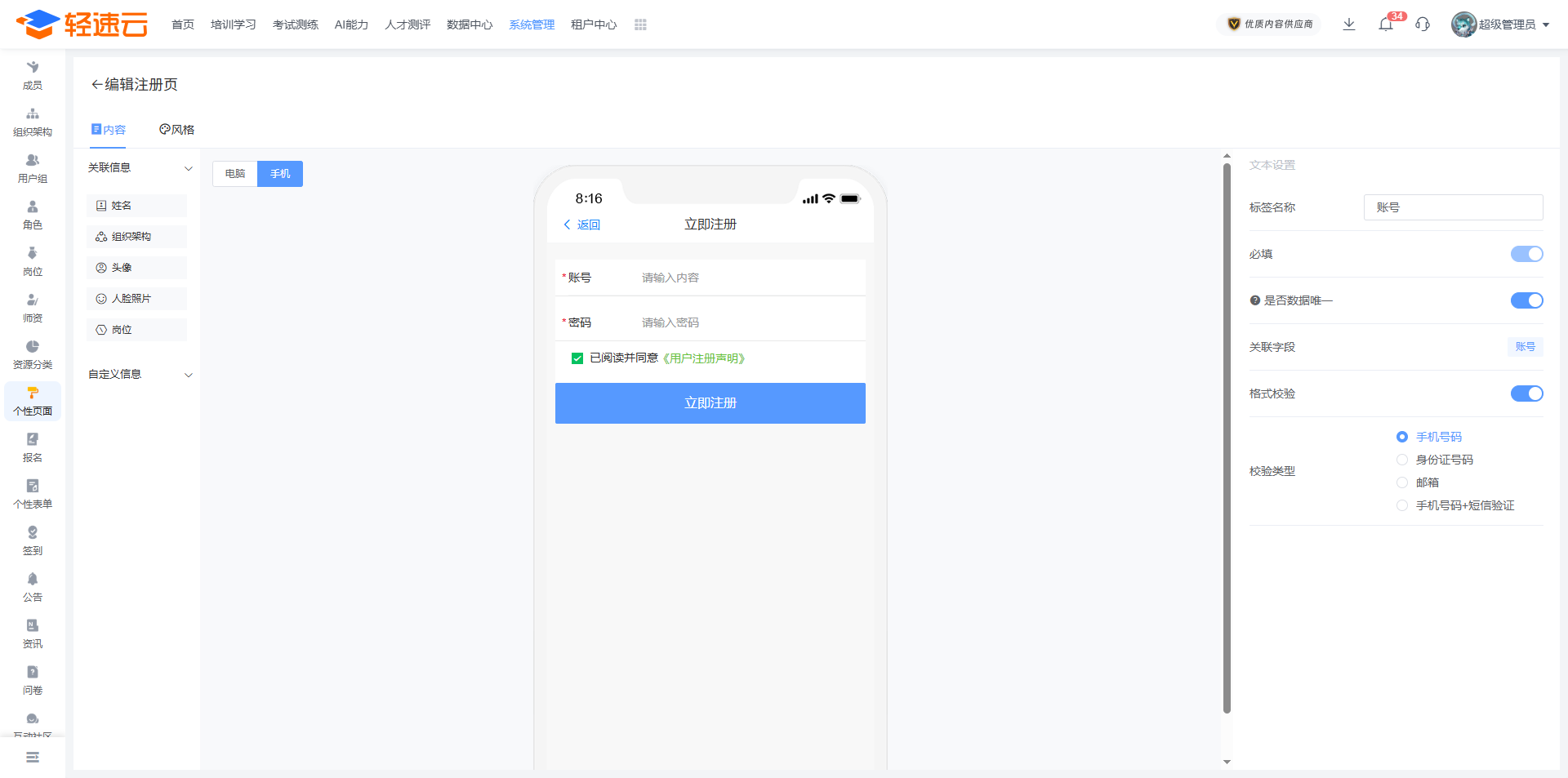 如果在 学员设置管理 中开启了允许成员注册,则可以通过这项功能来增加成员注册时的信息项并设置注册页面风格,电脑端和手机端需要单独设置。