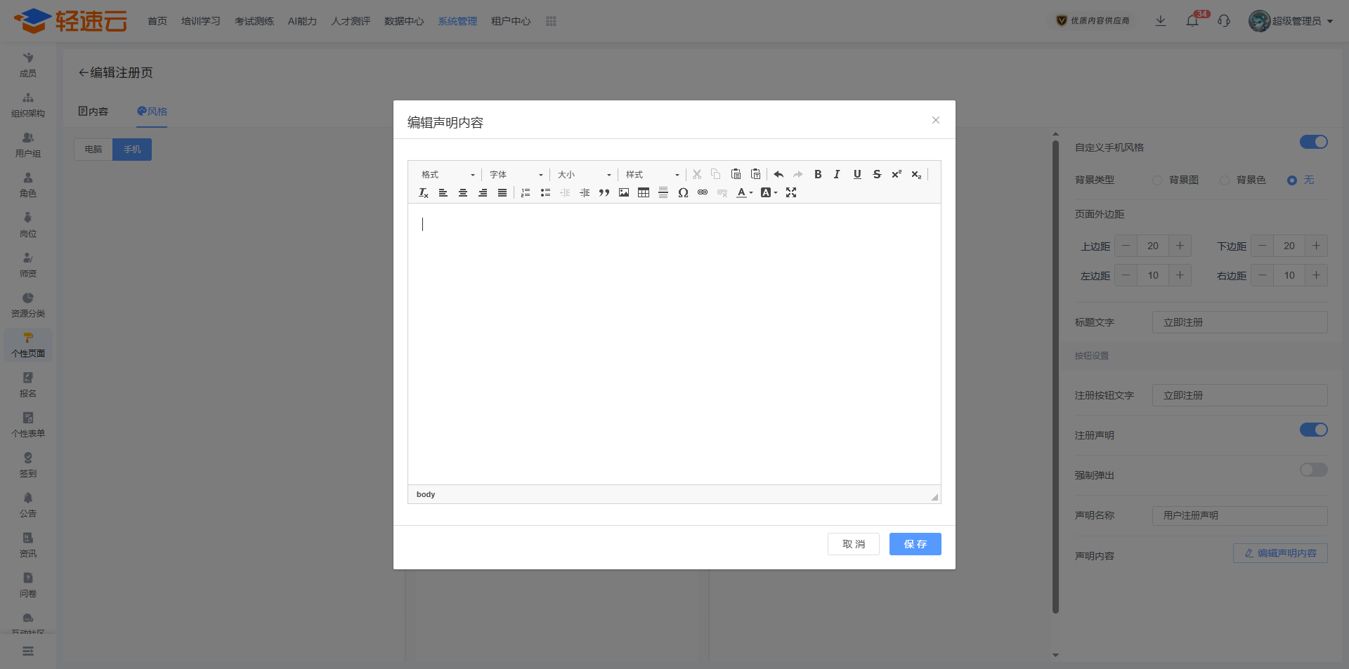 点击自定义注册页面左上角的 设置风格 按钮可以调整注册页面的风格,包含 背景 、 logo 、 边距 、 文字说明 等内容。