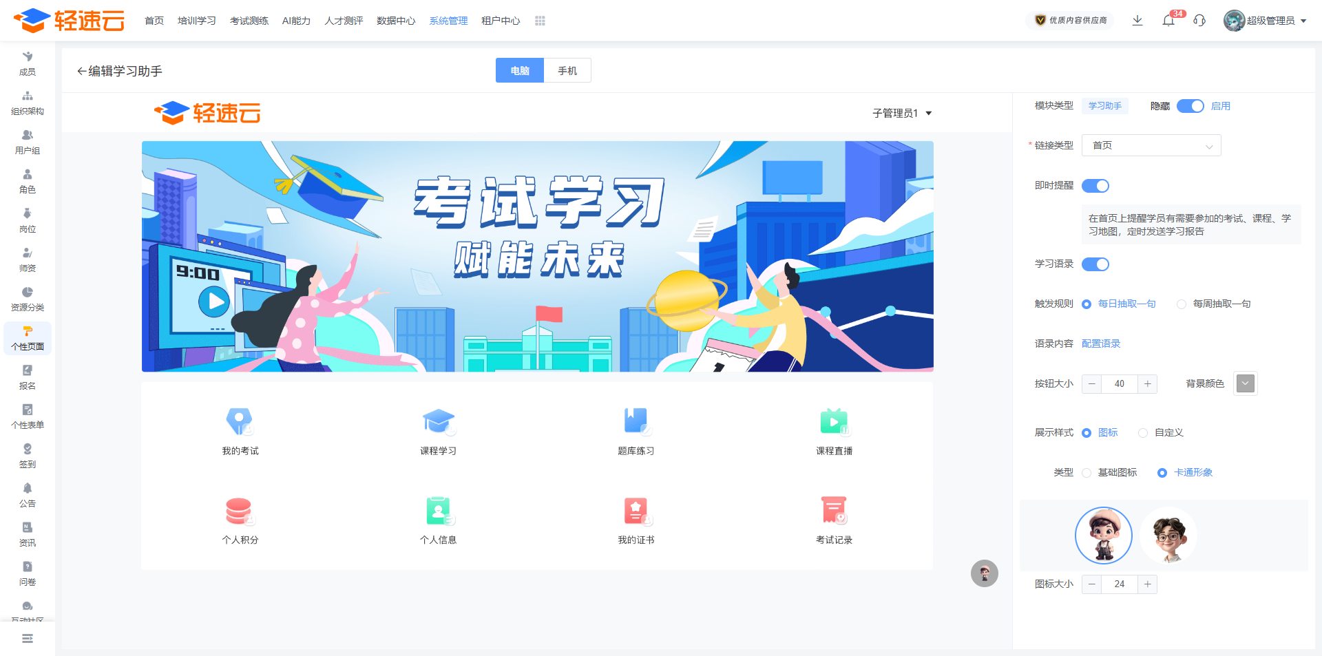 启用学习助手功能后,学员端全局所有页面中会出现一个可自由拖动的悬浮按钮,管理员能够编辑这个按钮的样式或者是使用的形象。