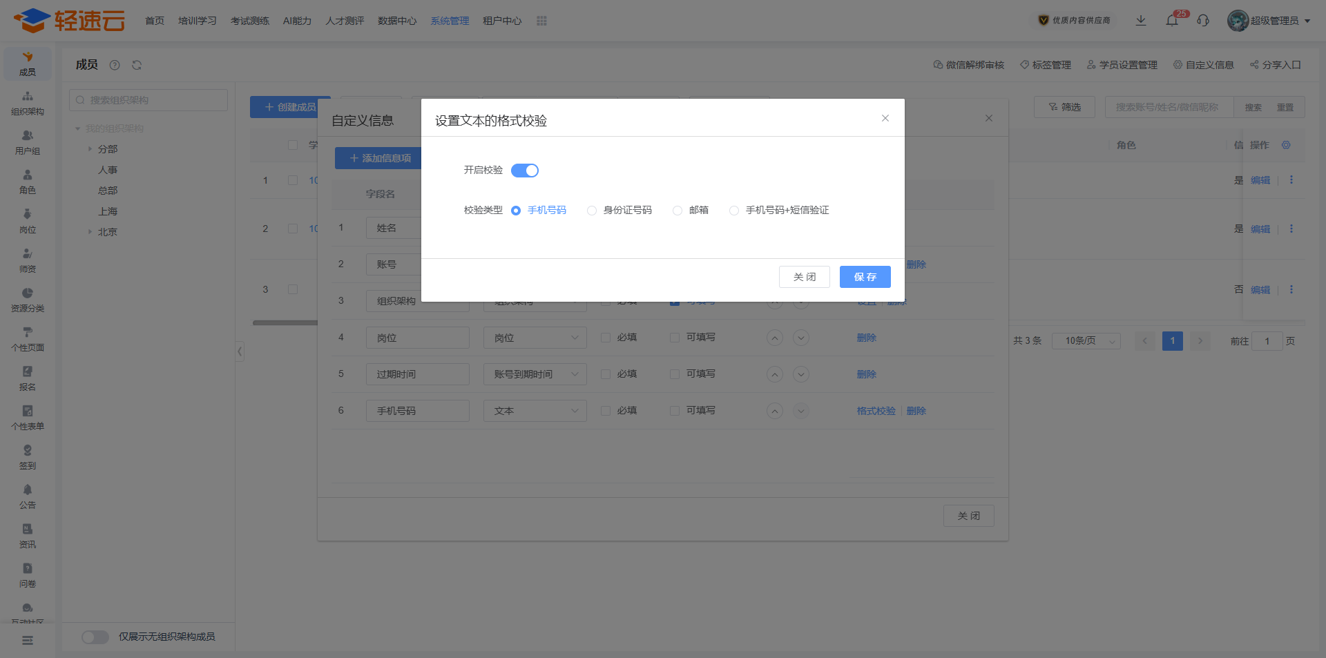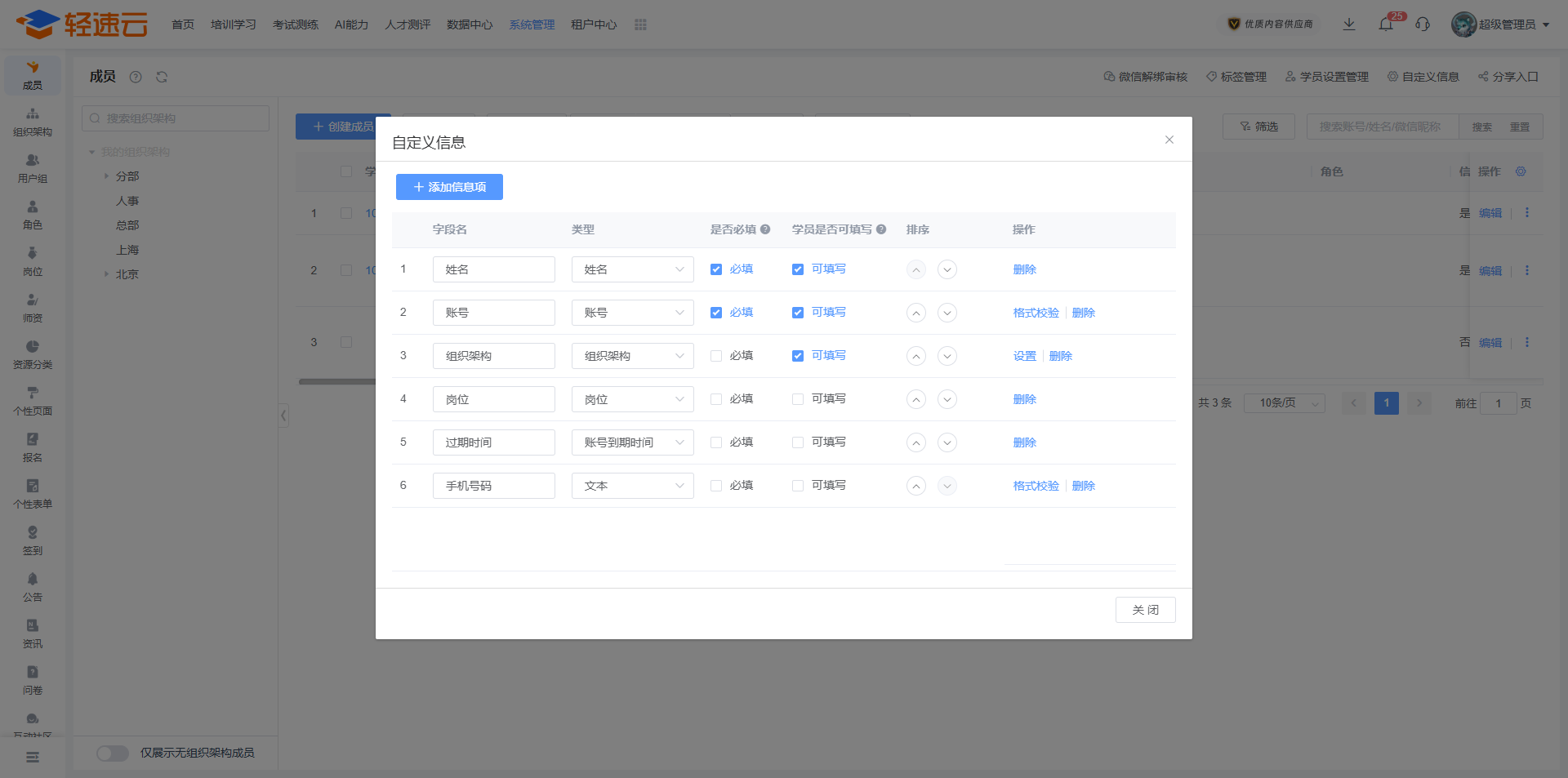是否必填:管理端创建、编辑、导入成员时,以及学员端编辑个人信息时,均会校验必填设置。学员是否可填:启用后,学员可通过注册页面与个人中心页面填写该信息,否则对应字段学员不可见,仅能由管理员进行编辑。格式校验:文本类型的自定义信息支持格式校验,支持验证手机号码、身份证号码以及邮箱。