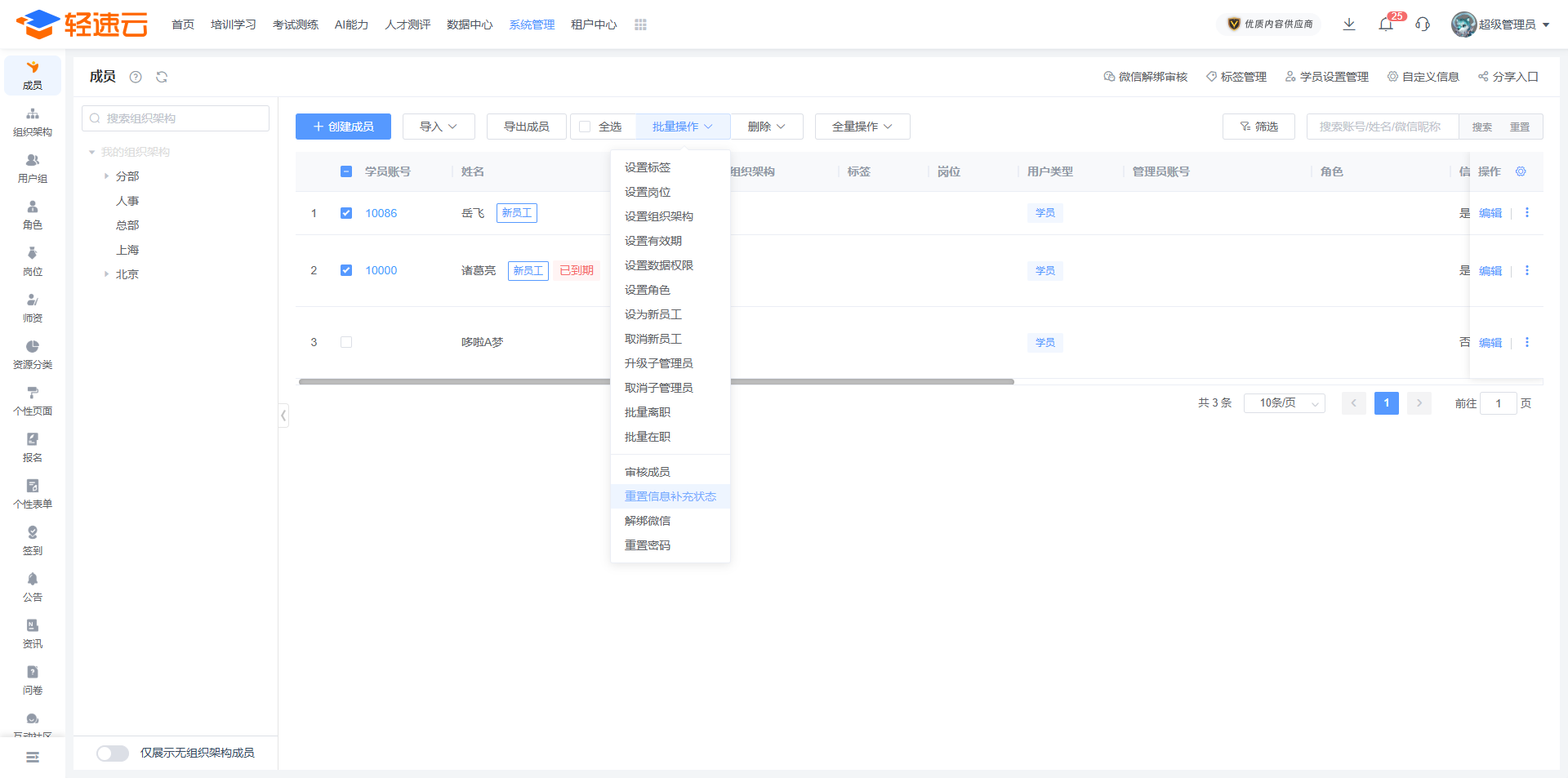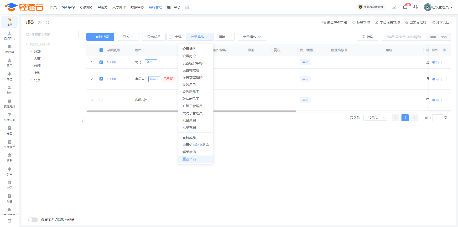 勾选多个成员,点击 批量操作 - 重置密码 可以快速设置多个成员的登录密码。