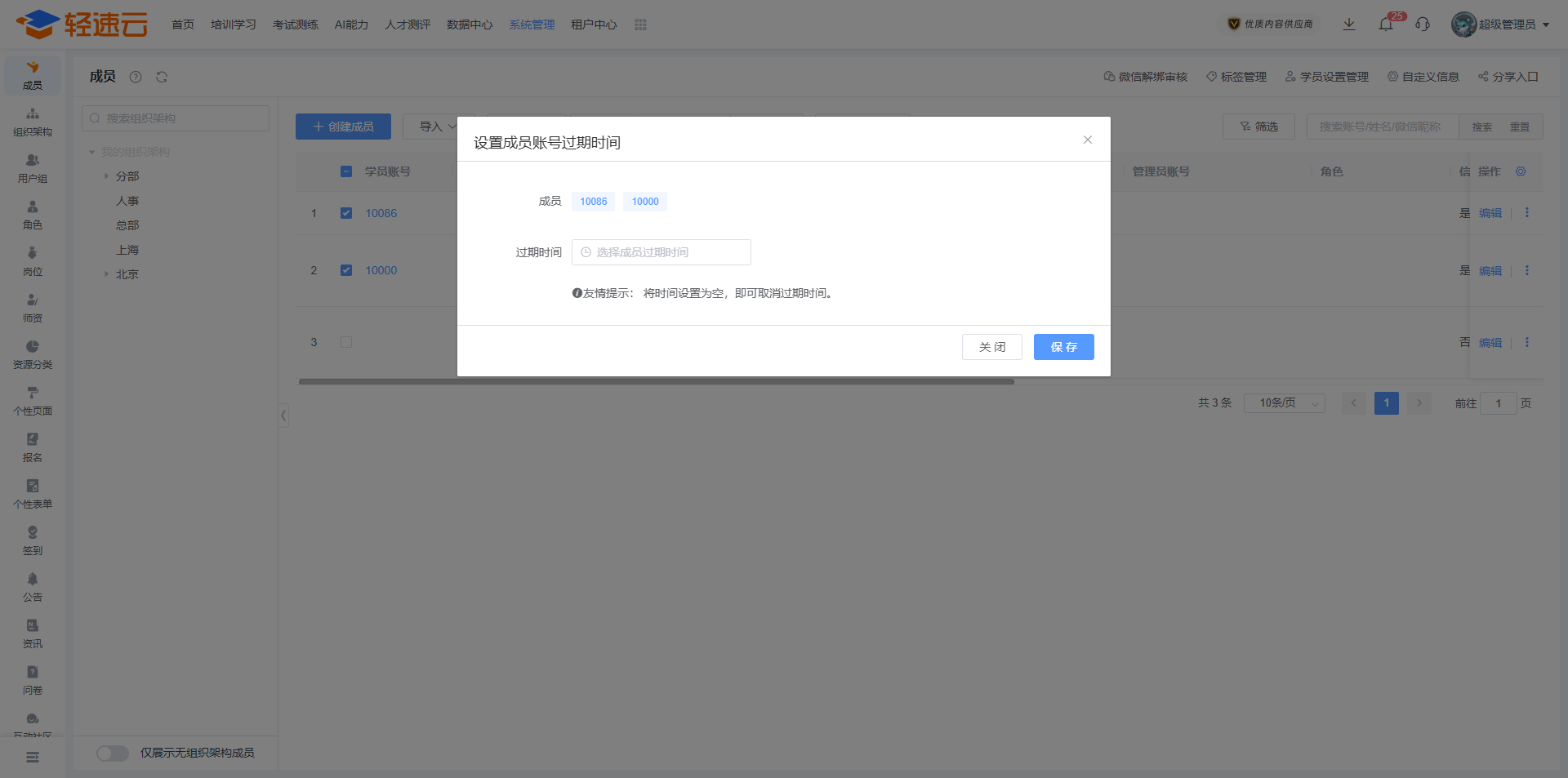 选中一个或多个成员后,点击顶部 批量操作 - 设置成员有效期 可以设置其账号的有效期。若不选择任何日期,则清空选中成员的有效期,使其账号永久有效。